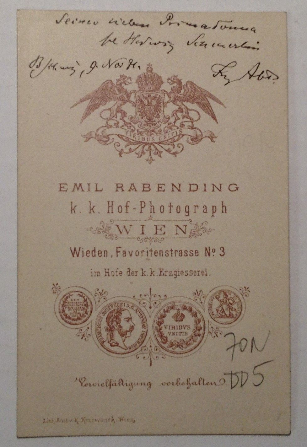 1870. Unbound. Inscribed photocard of the German composer and conductor; inscription on verso in German, along with Vienna photographer's information. Measures 4.5 x 2.5 inches, photo print sepia-tone with pale green border. No date, circa 1870. Fine.