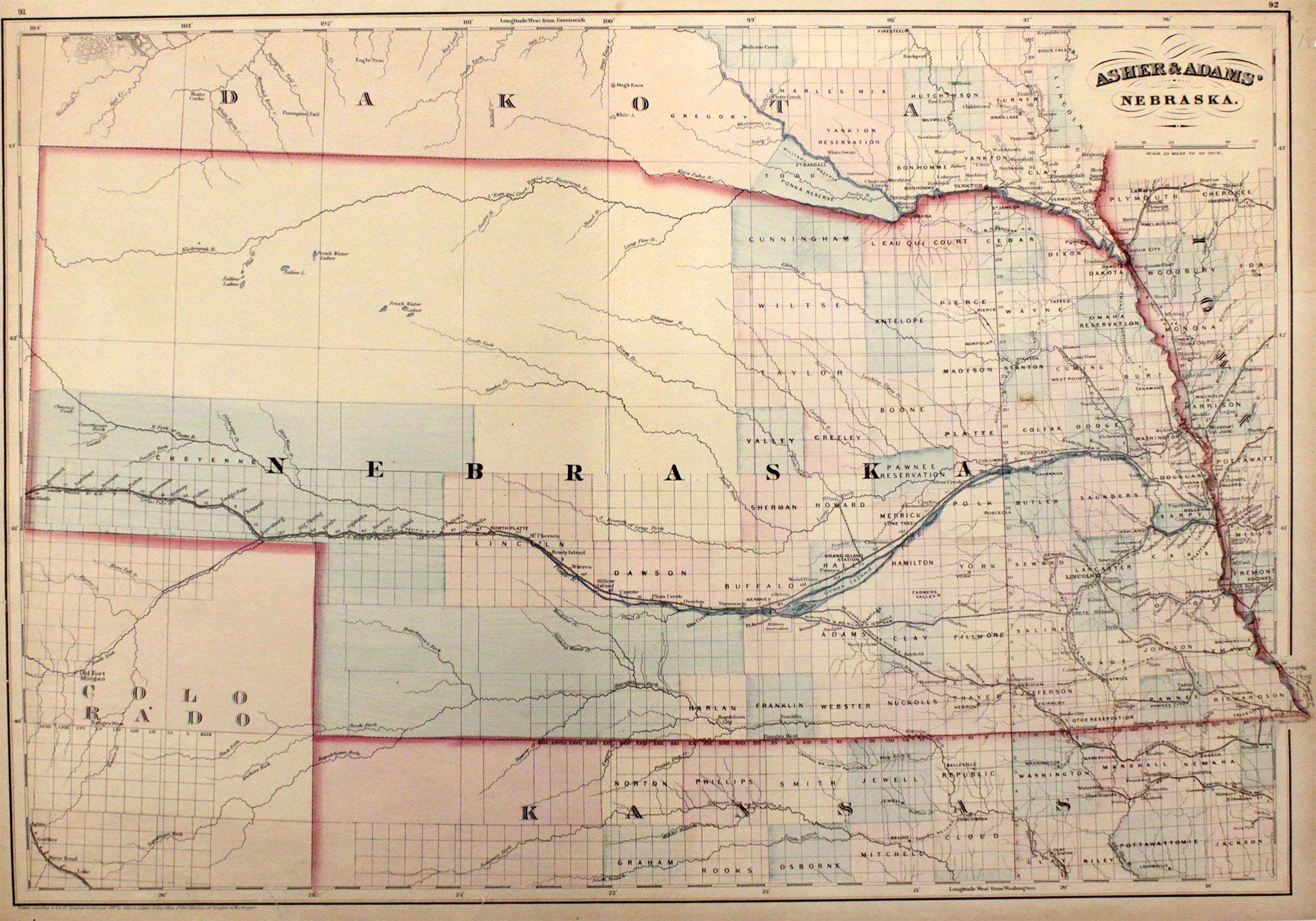 Great map of Nebraska divided into counties and townships. Shows towns, railroads and waterways. Some chipping along left hand margin that doesn't affect image. Asher & Adams were publishers based in Washington and New York in the late 19th century.