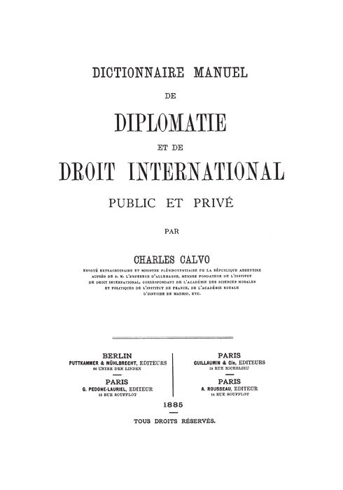 2015. ISBN-13: 9781584779490; ISBN-10: 1584779497. Uncommon Dictionary of International Law Calvo, Carlos [1822-1906]. Dictionnaire Manuel de Diplomatie et de Droit International Public et Prive. Originally published: Berlin: Puttkammer & Muhlbrecht [and others], 1885. vii, 475, [1] pp. Reprinted 2009, 2015 by the Lawbook Exchange, Ltd. ISBN-13: 9781584779490; ISBN-10: 1584779497. Hardcover. New. $34.95 * Reprint of the only edition. With index. Produced for diplomats, this is a one-volume distillation of Calvo's two-volume Dictionnaire de Droit International Public et Prive (1884) with additional material. The entries are rather detailed, often several paragraphs in length. Many entries have cross-references. CARLOS CALVO [1822-1906] was a distinguished Argentinean diplomat and scholar of international law. His works include the distinguished treatise Derecho Internacional Teorico y Practico de Europa y America (1868). Translated into French as Le Droit International Theorique et Pratique, it went through four further editions, the last one in 1896.