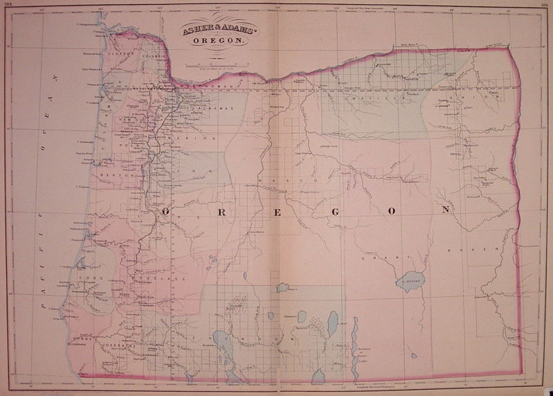 Nice clear double page map of Oregon divided into counties and some townships. Denotes towns, waterways, geographical details and railroad lines. In very good condition with light scattered foxing. Asher & Adams were publishers based in Washington and New York in the late 19th century.