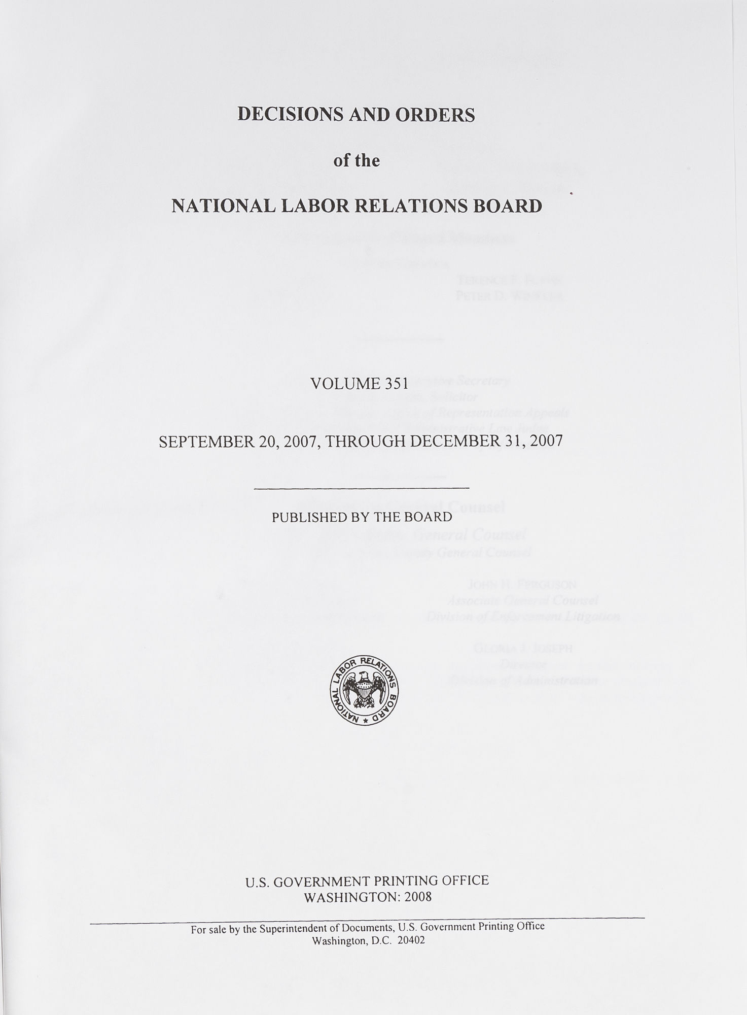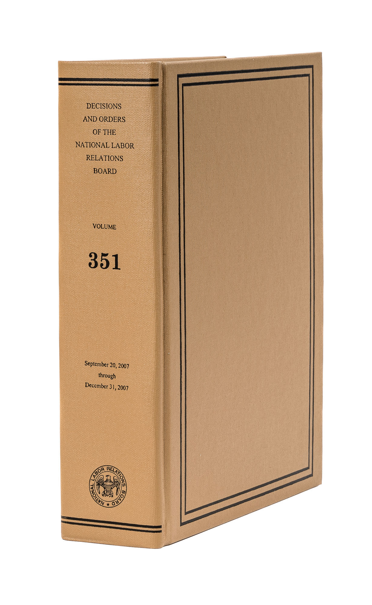 2008. [National Labor Relations Board]. Decisions and Orders of the National Labor Relations Board. Volume 351. Published by the Board. Washington: U.S. Government Printing Office, 2008. xi, 1439 pp. Cloth. New. $89. * Received February 2009 from the Government Printing Office.