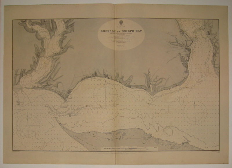 Beautifully detailed map of the coast line of Kherson Bay in the northern section of the Black Sea. Soundings in feet. Minor overall wear.