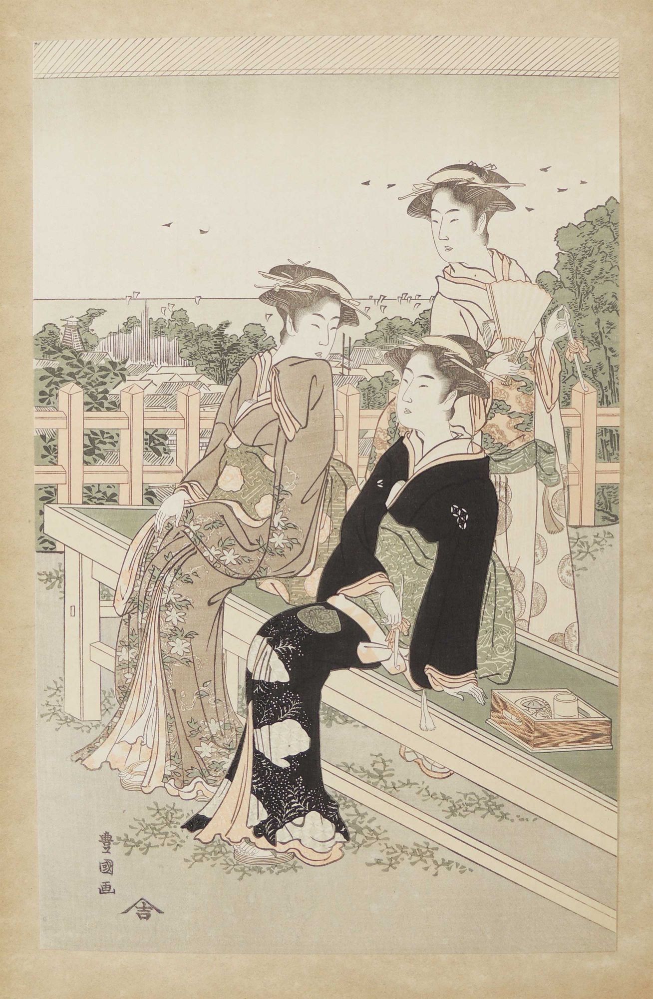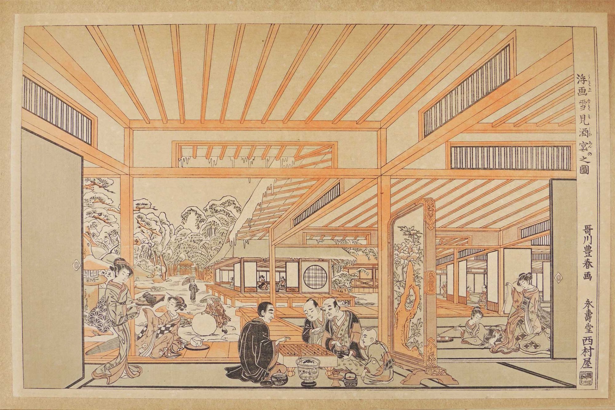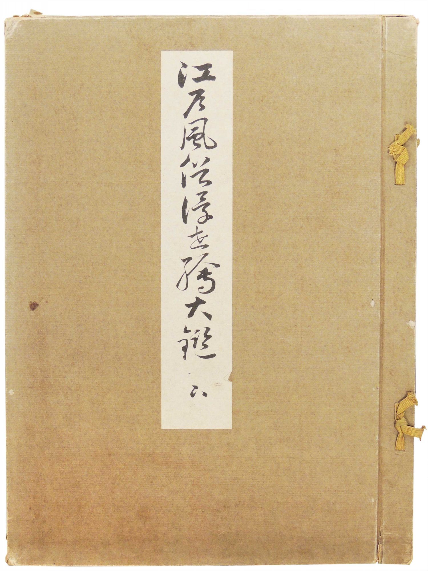 Paper Covered Boards. Very Good. Paper Covered Boards. Folio. In Japanese. Date unknown. Brown paper covered boards with black and white title pastedown to rear board. Scuffing to boards and wear to corners and edges. Exterior of rear hinge has a two inch closed tear in paper covering; binding remains secure. Stab binding with two yellow ribbons. Pages remain securely bound. Includes five beautiful Japanese woodcuts tipped onto cardstock paper. Two of the woodcuts are fold-outs (one having 3 panels). All prints are in color. The pages with text have some foxing and browning, but prints are very clean. Bubbling to endpages. Illustrations are suitable for framing. A nice copy. Measures 13 x 17.5 inches. ASART/082604.