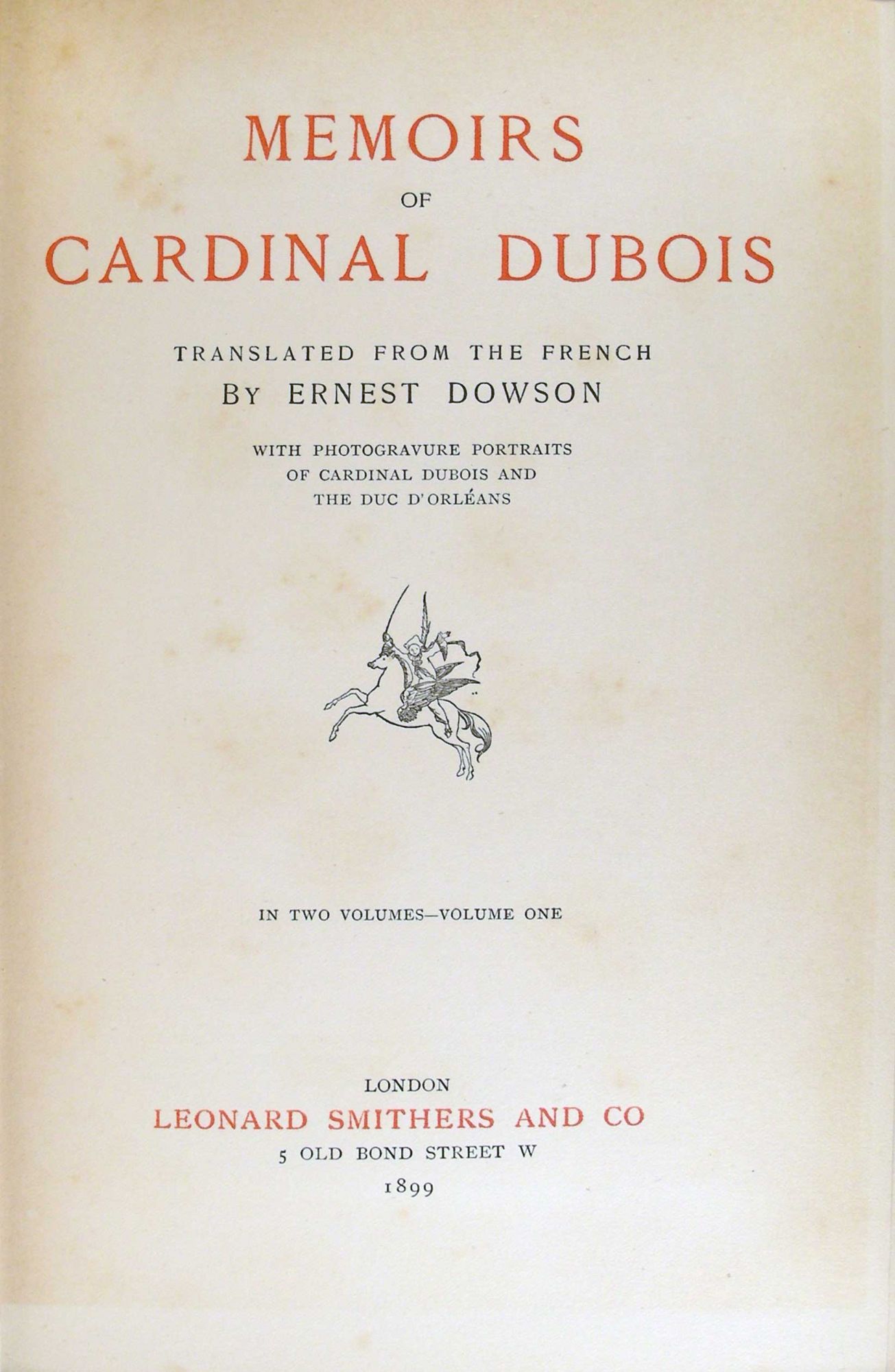 London: Leonard Smithers and Co, 1899. Hardcover. Very Good. Hardcover. Guillaume Dubois (1656-1723) was a French cardinal and statesman. He was considered one of France's four great Cardinal-Ministers (Richelieu, Mazarin, Dubois, and Fleury). He studied at the college of St. Michel in Paris, where he was befriended by the head of the college, who found pupils for him, ultimately leading to him becoming the tutor to the Duc d'Orleans. When the Duc D'Orléans became regent in 1715, Dubois was made councillor of state. He was subsequently invested as a Cardinal. Dubois was instrumental in negotiating the Triple Alliance in 1717 among the French, British, and Dutch to counteract the power of the Spanish. Dubois supposedly wrote these memoirs in the last two years of his life. According to the prefatory note to this volume (quoting the preface of the initial French edition of 1829), there was great intrigue concerning the publication of these memoirs. The original was ostensibly stolen by Dubois' secretary, who intended to sell it to the family. Because of its scandalous nature, he waited until most persons named in it had died. When he did try to sell it, Versailles intervened and obtained the original, which it stored, not releasing it for publication. It was then copied by a comte, whose copy was published after his death. But the original manuscript was never found, leading to suspicions that it never existed. So, is this the real memoir of Cardinal Dubois, or is it a fake? Regardless, it is a very entertaining story of the time of Louis XIV and Louis XV. Octavo. Bright blue cloth boards with gilt fleur-de-lis on front and title on spine of each volume. Includes frontis of Cardinal with tissue intact. Deckle edge paper in great condition. Vol. 1 282 pages, Vol. 2, 268 pages. FRA/5163.