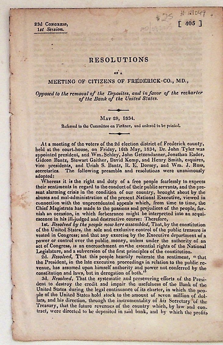 Resolutions of a meeting of citizens of Frederick Co., MD, opposed to the removal of the Deposites, and in favor of the recharter of the Bank of the United States