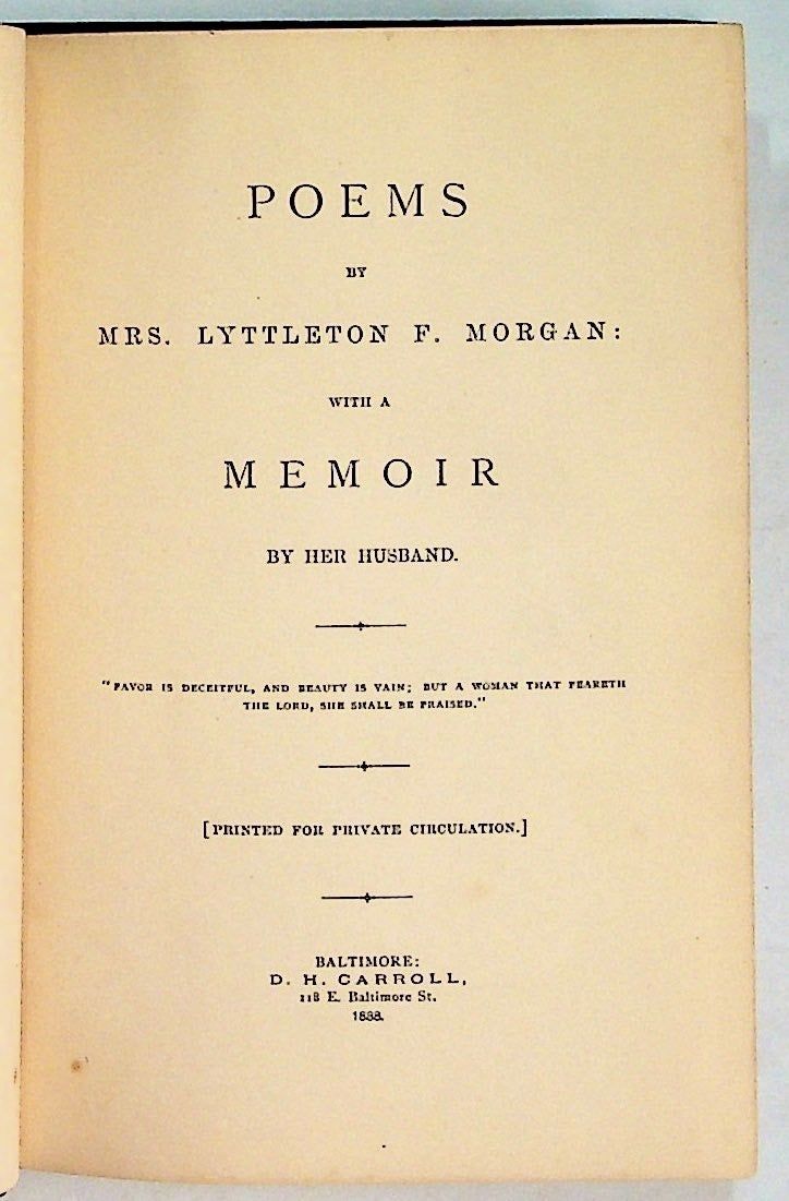 Baltimore: D.H. Carroll, 1888. Hardcover. Very Good. Hardcover. EXCEPTIONALLY SCARCE. Susan Rigby Dallam Morgan was the wife of Reverend Lyttleton F. Morgan, who was a long-time board member of what was originally the Centenary Biblical Institute (founded 1867), and was renamed to Morgan College in 1890 in his honor after he gave a large endowment to the institution. Susan Morgan died in 1887. The volume is a memorial tribute produced by her husband, with a memoir written by Reverend Morgan. It was printed for private circulation. The poems are predominantly religions in nature. There are two handwritten inscriptions on the front free flyleaf. The first states "Received this book from Dr. Morgan at whose house I was very often the guest of himself and his estimable wife." It is undated and unsigned. The second is a note of transfer of the book in 1930. Octavo. Top edge of pages in gilt. Minor rubbing to exterior and bumping to corners and spine ends especially to the foot of spine. Gift inscription, and the following comment: Received this book from Dr. Morgan at whose home I was very often the guest of himself and his estimable wife. Else is clean and bright. 336 pages. Poetry. POE2/9010.