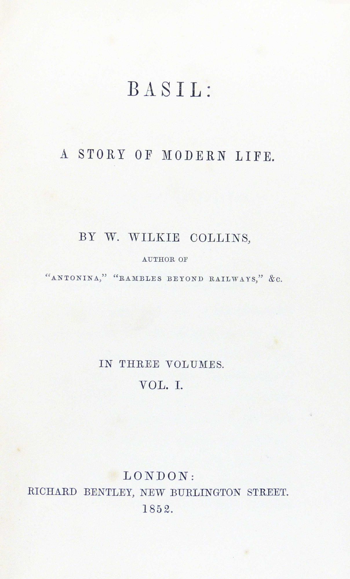 London: Richard Bentley, 1852. Hardcover. Very Good. Hardcover. THE FIRST EDITION of Collins's scarce second novel. This is Collins's second full length novel and his first set in contemporary times. This novel of first love, intrigue, and betrayal was considered "sensational" by many, and it had mixed reviews, with some referring to it as "revolting." In his dedication he writes that he "has not hesitated to violate the conventionalities of sentimental fiction." In later editions, he did shorten the text and tone down the violence. "In Basil, he found his true métier as an expert in mystery, suspense, and crime" (Oxford Companion to English Literature). Three volumes bound in two. Bound in three quarter tan calf with marbled paper covered boards, with red leather labels with gilt titles to the spines of both volumes. There is some rubbing and scuffing to leather. Gilt tooling to compartments on spine, some of which has been rubbed. Full marbled edges and marbled end pages. These books remain quite attractive, though there is minor rubbing to the leather along the joints and minor bumping to the corners. There is minor foxing to the first and last few pages of both volumes but otherwise the interior is very bright and clean. LIT/092906.