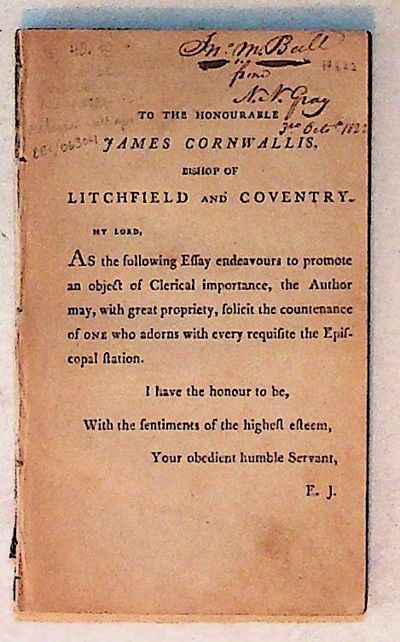 Paperback. Good. Paperback. Paper. No Jacket. 8vo. Dedicated "to the Honorable James Cornwallis, Bishop of Litchfield and Coventry" from 1781 - 1824. Signature from previous owner dates from 1822. This essay no longer has boards, but pages are very clean with minor foxing and bright text. Signatures remain firmly sewn and glued together. Good reading copy. 75 pp. REL/063004.