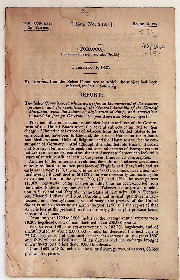 Tobacco [To accompany joint resolution, No. 25] February 18, 1837. Mr. Jenifer, from the Select Committee to which the subject had been referred, made the following Report: The Select Committee, to which were referred the memorial of the tobacco planters, and the resolutions of the General Assembly of the State of Maryland, upon the subject of high rates of duty, and restrictions imposed by forign Governments upon American Tobacco