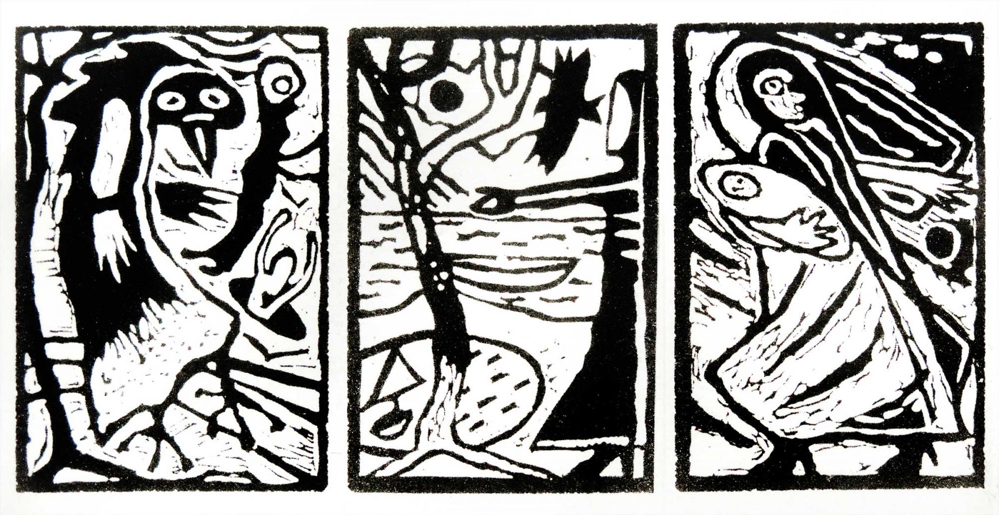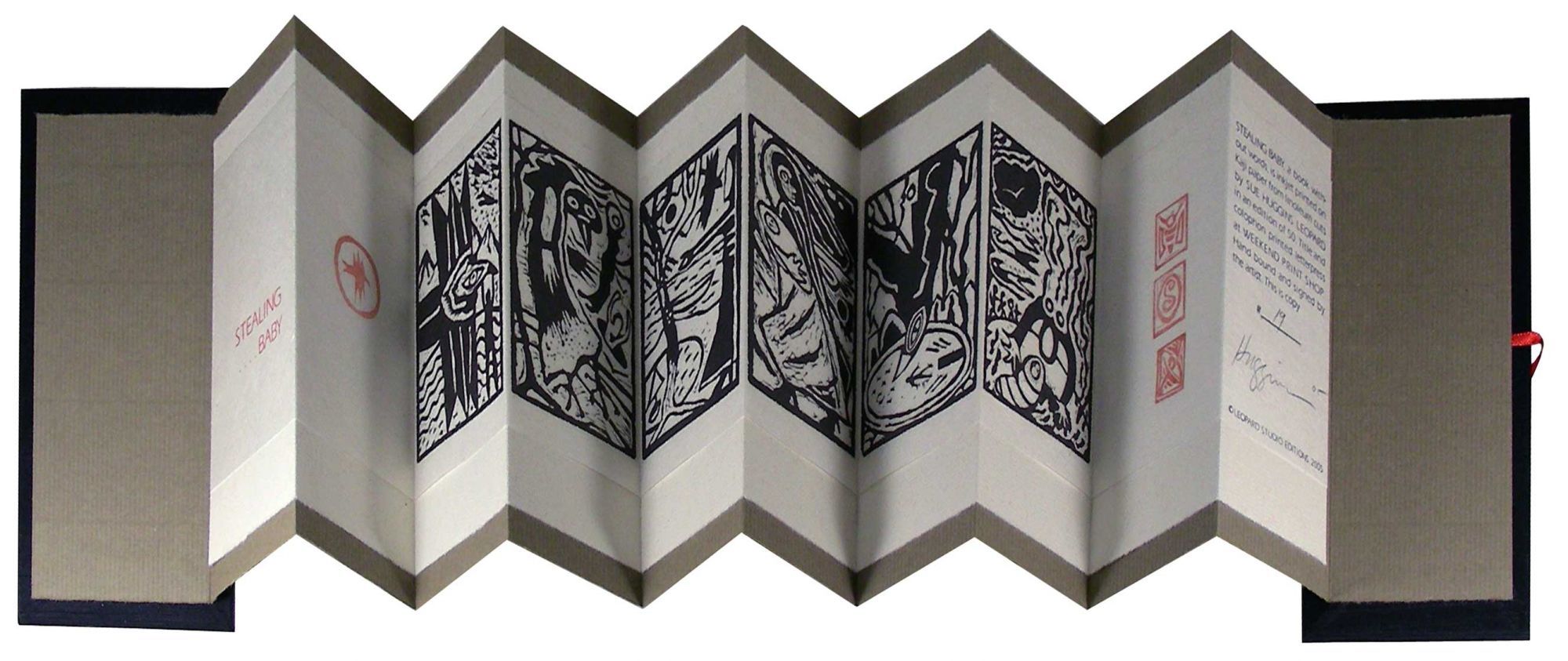 Rochester, NY: Sue Huggins Leopard, 2005. Hardcover. Fine. Leopard, Sue Huggins. Leopard, Sue Huggins. Hardcover. 16mo -. 19 of 50 copies. SIGNED BY ARTIST. An interesting book without words by this noted book artist and printmaker. Black and white lineleom block prints on accordian folded pages indeed depict a predatory bird stealing a baby. The primitive looking prints evoke the eeriness of the event. Inkjet printed on Kaji paper at the Weekend Print Shop. Bound in black cloth with long red ribbon ties, and signed on colophon by artist. Unpaginated. PRI/051107.