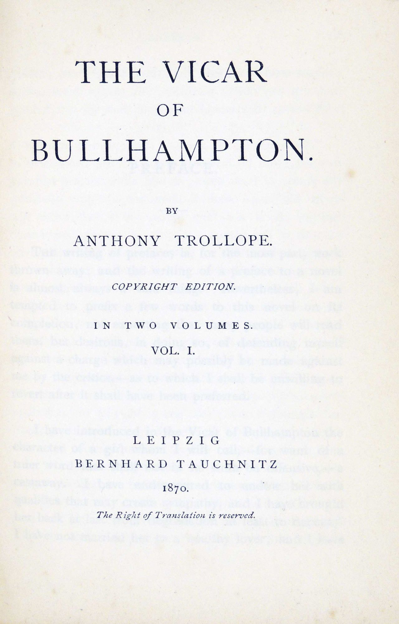 Leipzig: Bernhard Tauchnitz, 1870. Hardcover. Very Good+. Hardcover. 12mo. In black modern leatherette binding with gilt title stamp to both spines. Interiors are slightly toned but in lovely shape for their age. Very small chip to pages 60-65 of vol 1 otherwise very clean and bright. vol 1, 368pages, vol 2, 358pages. In the rear of volume 2 is a listing of Tauchnitz titles dated December 1, 1909. LIT/011505.