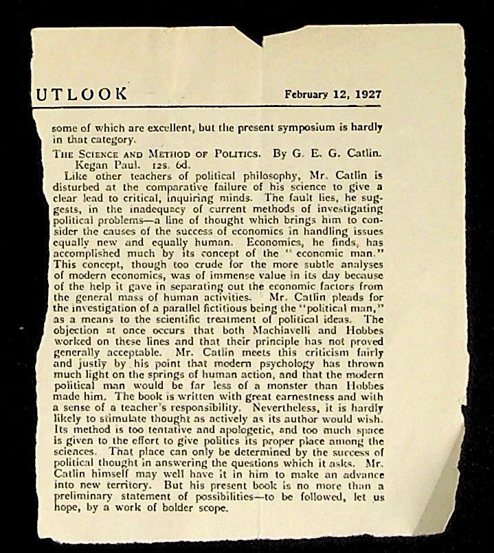 London: Kegan Paul, Trench, trubner and Co., Ltd, 1927. Hardcover. Very Good. Hardcover. Sir George Catlin (1896-1979) was an English political scientist. He entered this field in its relative infancy, especially in England. It was more advanced in the United States, and Catlin spent much of his life as a professor at Cornell University and other universities and colleges in the United States and Canada. He was a strong proponent of Anglo-American cooperation and wrote a book titled One Anglo-American Nation (1941). Catlin completed his PhD at Cornell, and this publication was his doctoral thesis. It is divided into 3 parts: Politics, History, and the Data of Politics; The Method of Politics; and Politics and Ethics. The second part particularly focuses on the new field of political science, with chapters on The Possibility of a Political Science; The Place of Politics Among the Social Sciences; and The Process of Politics. The book includes a tipped-in contemporaneous review from The Outlook (1927), which includes a quote, "Mr. Catlin is disturbed at the comparative failure of his science to give a clear lead to critical, inquiring minds." An interesting perspective on a newly-developing social science field. Octavo. Blue cloth covered boards with gilt title to spine. Front cover is bubbled near right edge. Front and back covers have some rubbing and fading. Sunning to spine. Pages are yellowed but clean. 360 pages, including index. POLSCI/070506.