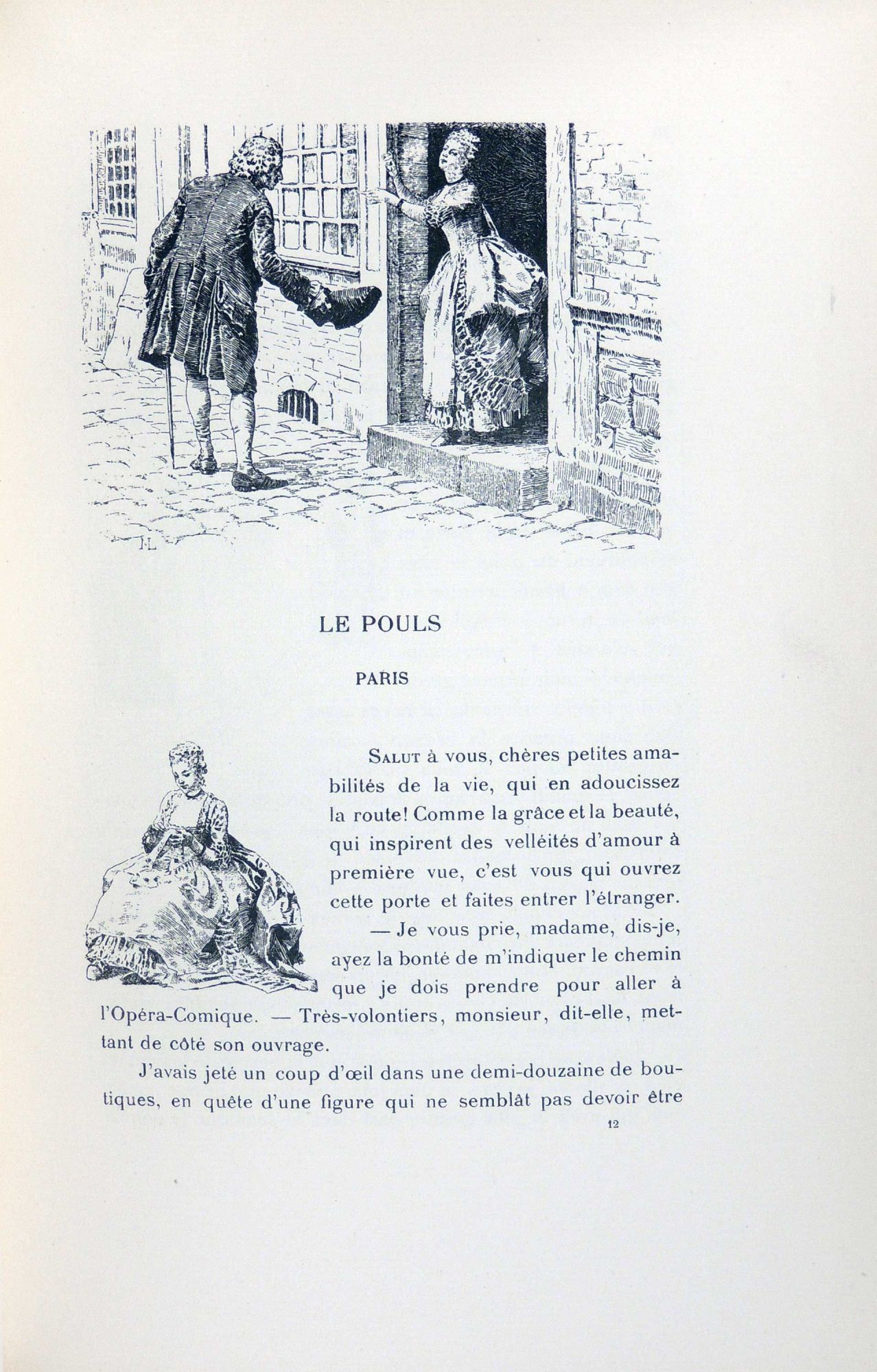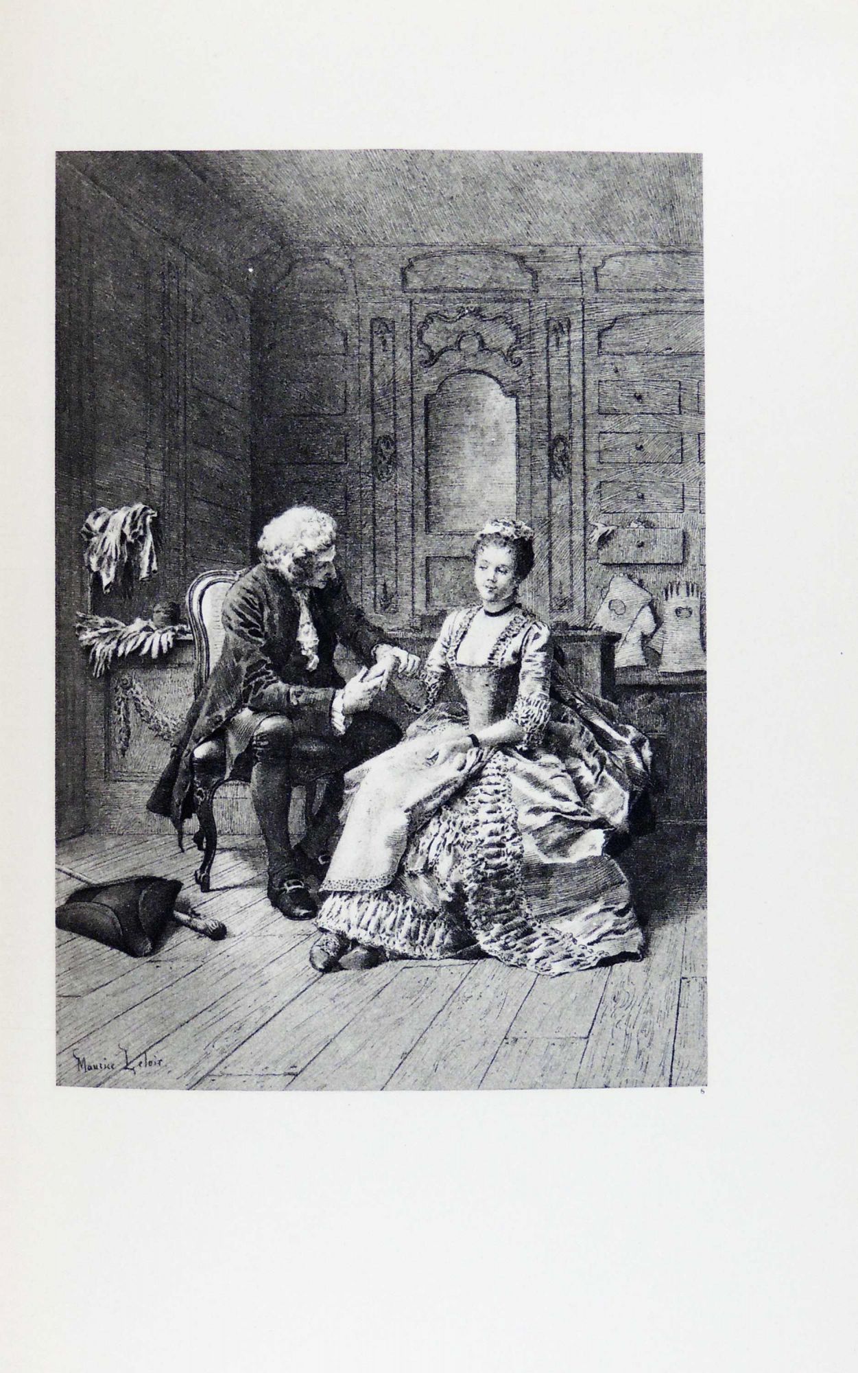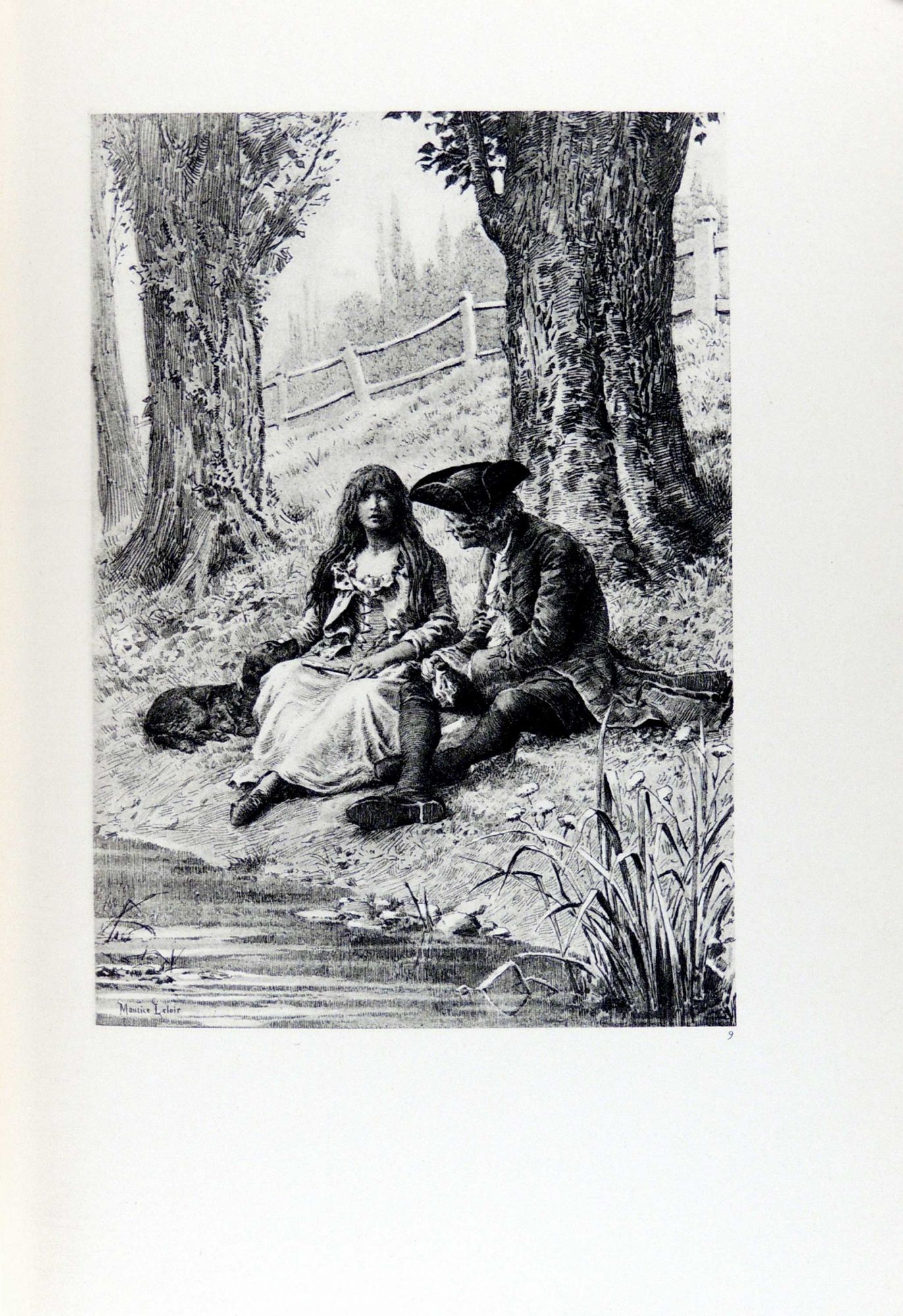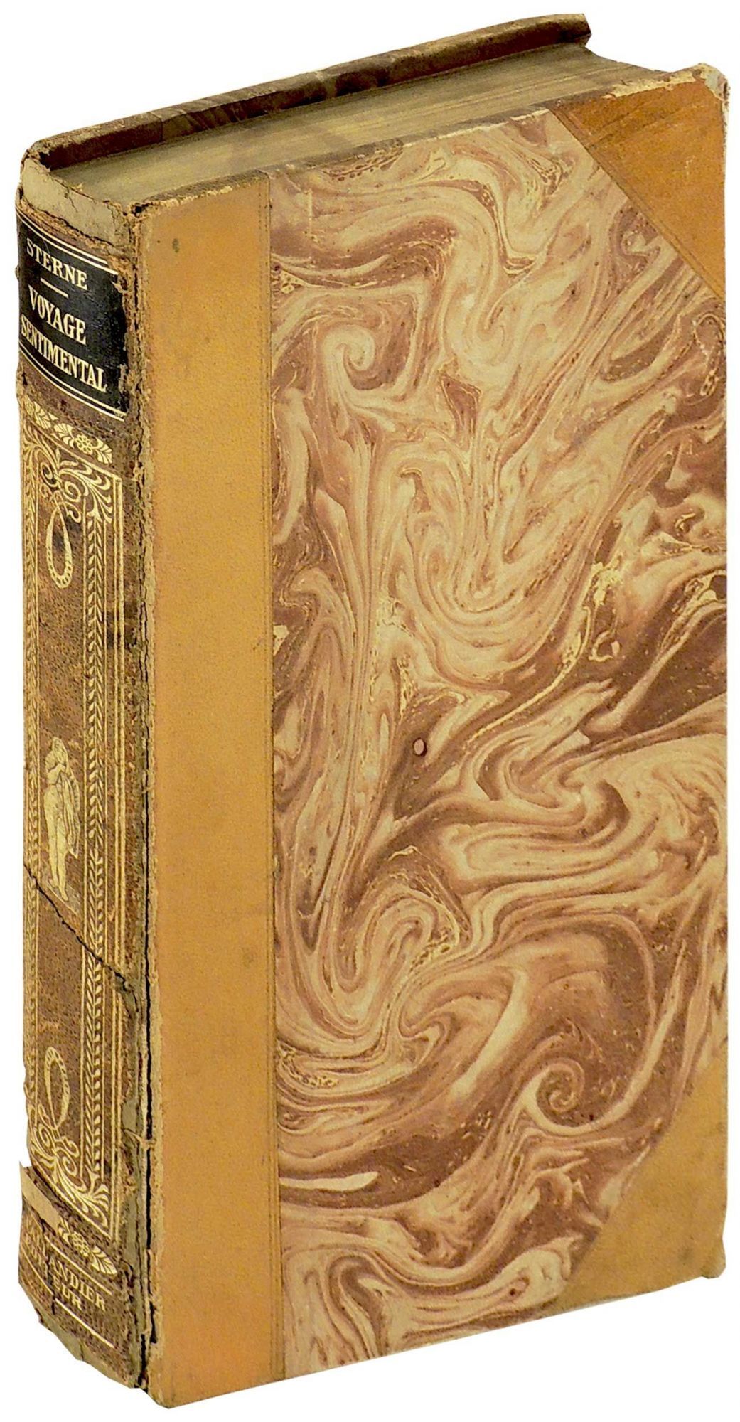 Paris: Jules Tallandier, 1920. Hardcover. Very Good +. Hardcover. VERY SCARCE IN THE UNITED STATES. Laurence Sterne (1713-1768) was a British author who was born in Ireland. He is best known for his comic writing, especially The Life and Opinions of Tristram Shandy, Gentleman (released in volumes from 1759–1767). His second most popular novel was A Sentimental Journey Through France and Italy, initially published in 1768, the year of Sterne's death. It has many similarities to Tristram Shandy, but was considered more sentimental and less bawdy. There have been several translations of this work into French. This volume is a translation by Emile Blemont, first published in 1884. Blemont was a significant French poet and playwright, and he was in the circle of Victor Hugo and the Symbolist poets. More importantly, this 1884 publication was illustrated by a famous French illustrator, Maurice Leloir. According to the Art Institute of Chicago, Leloir produced twelve photogravures and two hundred twenty photomechanical relief prints in black on ivory wove paper for the 1884 edition. This volume was published by Editions Jules Tallandier in Paris. The publication date is not stated, but Jules Tallandier was not established until 1901, and did not immediately publish under this name. Other sources indicate that the date of publication was around 1920. The reproduction of all of Leloir's 12 photogravures appear to be intact, with tissue guards for each, and the other illustrations are also reproduced. This is a very nicely-produced publication, with the interior in near fine condition. Octavo. Three quarter tan leather binding with marbled paper covered boards and leather title label to spine. Illustration in gilt of a lady to the spine. Large chips missing to spine above and below title, heavy wear to hinges, and repaired crack to spine. Gilt label and design on spine. In French. 210 pages. FRE/2133.