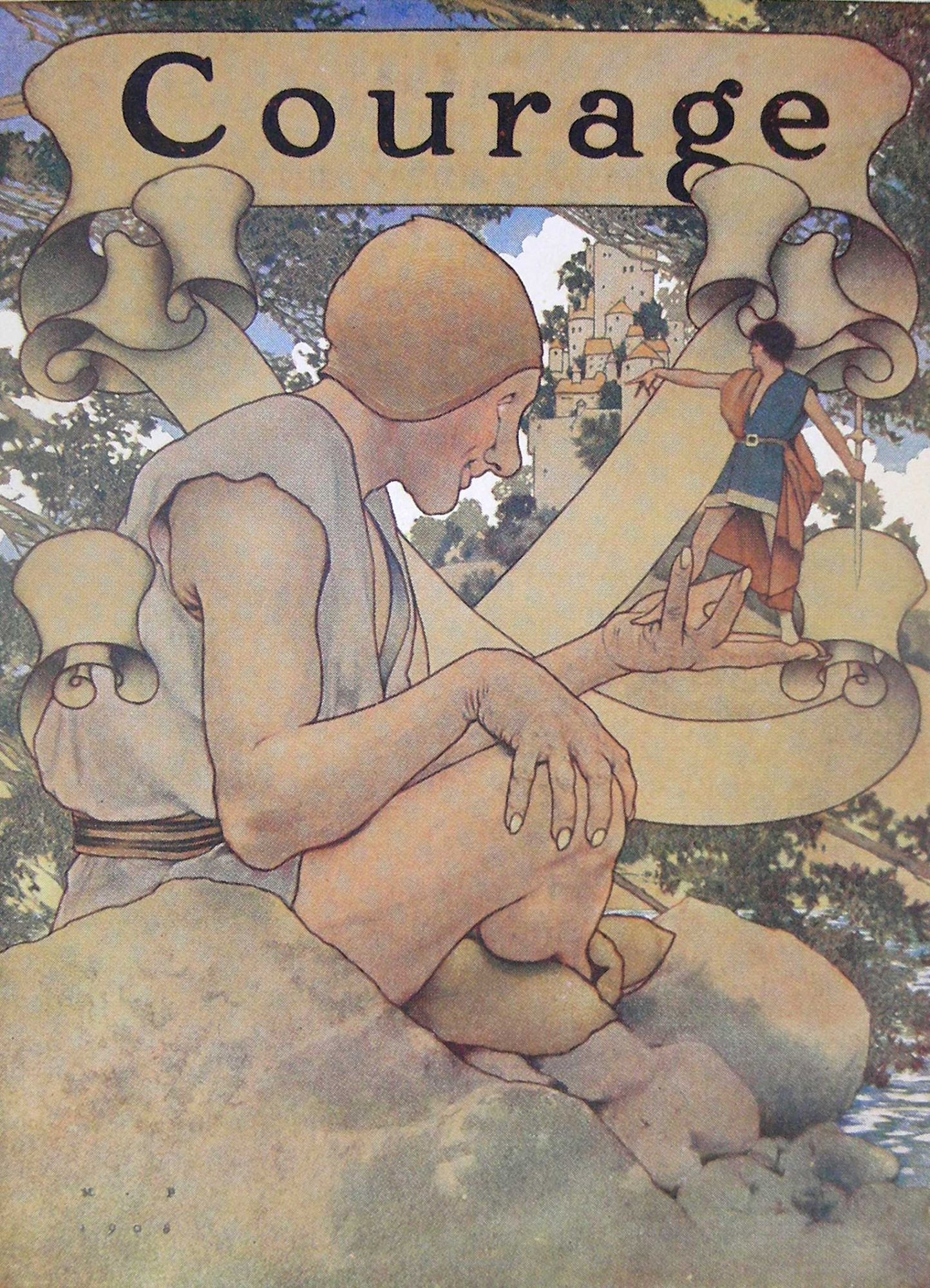 New York: Duffield and Company, 1916. Hardcover. Very Good. Parrish, Maxfield. Parrish, Maxfield. Hardcover. This scarce title includes a charming MAXFIELD PARRISH frontispiece color illustration titled “Courage.” With over 40 short stories for children. Very good in red cloth boards with dark red title and illustration to spine and front board. There are a few white scuff marks to the front board, minor wear to edges, and a small closed tear to head of spine. There is minor foxing to the first few pages and a few pages have folded corners. This uncommon book would make a nice addition to a Maxfield Parrish collection. Octavo. 341 pages. CHILD/041107.