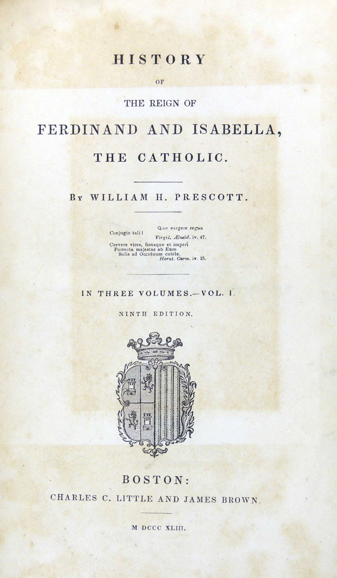 Boston: Charles C. Little and James Brown, 1843. Hardcover. Good +. Hardcover. Ninth Edition, 3 Volumes, 8vo. Good plus full leather w/gilt bordered bands to spine; brown & gilt title label to spine is only present on vol. 2, and lacks right half. Boards are quite scuffed and worn, especially along the edges, hinges, and head/foot of spine. Spotty foxing throughout volumes, heavy on endpapers and engraved frontis./plates, all of which have their original protective tissue paper. Bindings are quite tight overall, ffep to inscription page in vol.1 are loose. 411, 509, 531 pp. Spanish History. This set may require an extra shipping fee. SPA/6193.