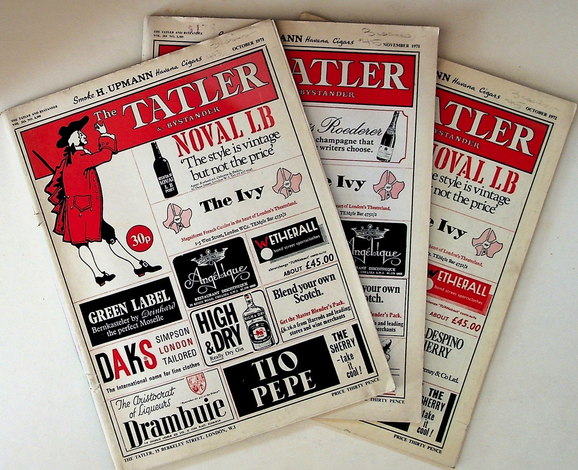 London: The Tatler, 1974. Paperback. Very Good. Paperback. Very good magazines bound in white paper wrappers with illustration to covers. Side-stapled. Oversized. Includes: February 1971, February 1973, and August 1974. Minor wear and rubbing to covers and edges. Periodicals. PER1/5082.