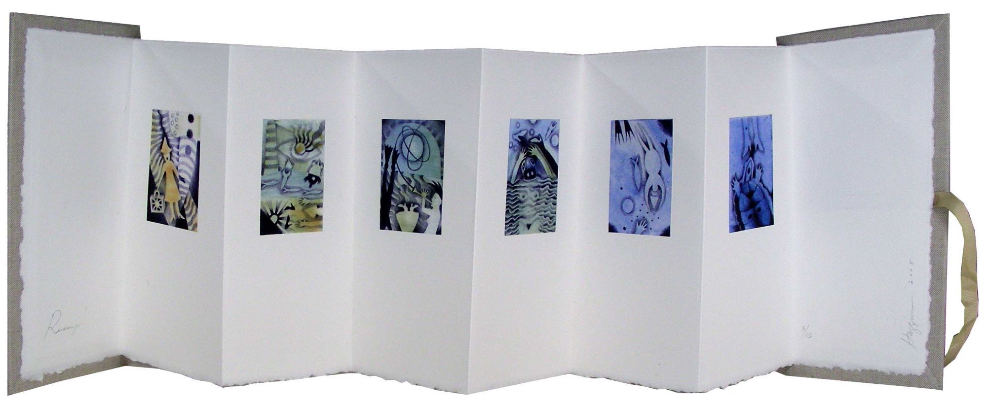 Rochester NY: Leopard, Sue Huggins, 2005. Hardcover. Fine. Leopard, Sue Huggins. Leopard, Sue Huggins. Hardcover. 8vo. 3 of 10 copies. SIGNED BY ARTIST. Lovely work by this noted printmaker and book artist. Fine in beige cloth boards with title label on front and long beige ribbon ties. Six accordion style fold out pages reproduce stunning color prints by Huggins, each with a water theme. Unpaginated. PRI/051107.