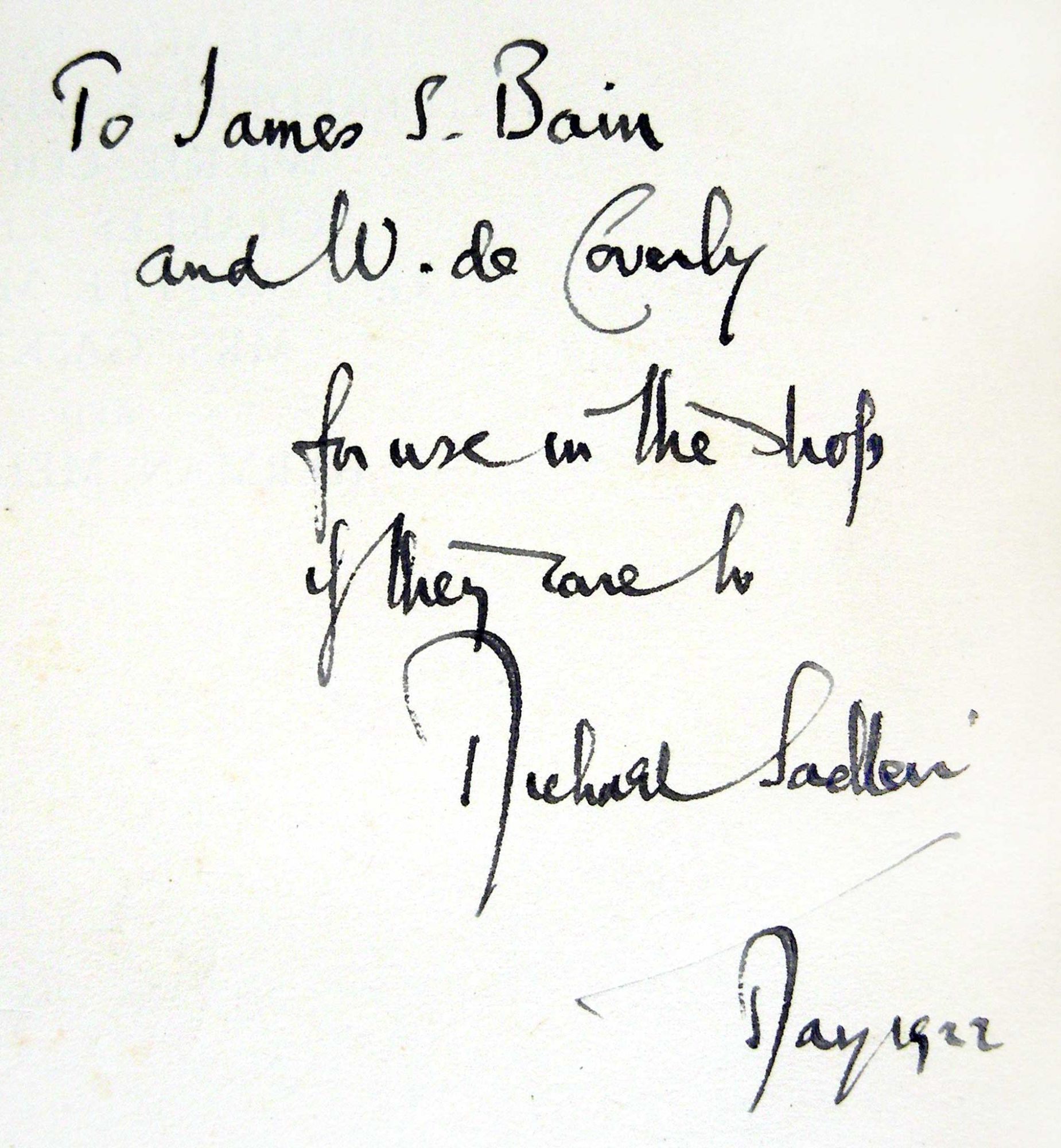 London: Chaundy & Cox, 1922. Hardcover. Very Good. Hardcover. INSCRIBED FIRST EDITION. Michael Sadleir (1888 - 1957) was the most noted scholar and bibliographer of Victorian literature of his time. In this work he calls the material included his “notes” rather than an exhaustive bibliography, and speaks of his great love for the Victorian novelists. Those included here are Anthony Trollope (his favorite), Benjamin Disraeli, Frederick Marryat, Wilkie Collins, Charles Reade, G.J. Whyte Melville, Mrs. Gaskell, and Herman Melville. There are several introductory pages on the writing of each author followed by the bibliographical notes. The book is inscribed “To James S. Bain and W. de Coverly for use in the shop if they care to Michael Sadleir May 1922.” Bound in very good black cloth boards with gilt title and author to spine. The interior is clean and bright except for browning to front and rear endpapers and slight aging to margins of pages. 240 pages including an index of titles. BOB/062008.