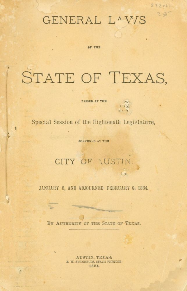 • Austin, Texas: R.W. Swindells, State Printer, 1884