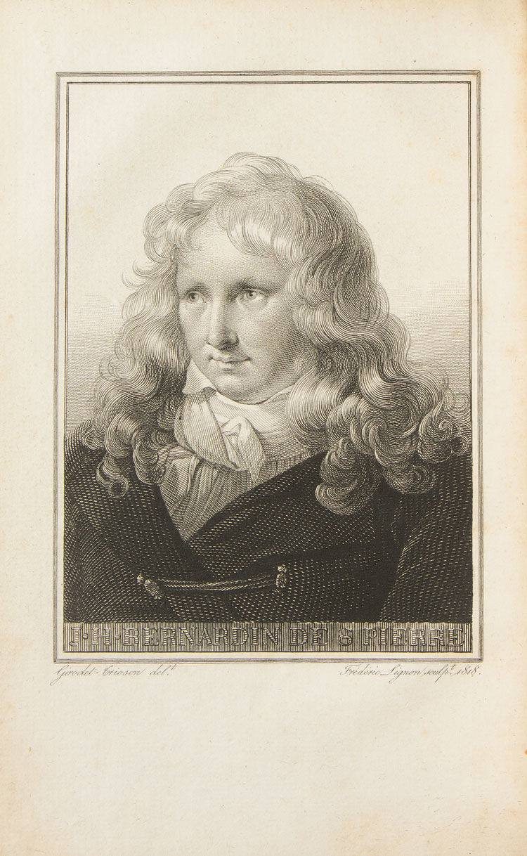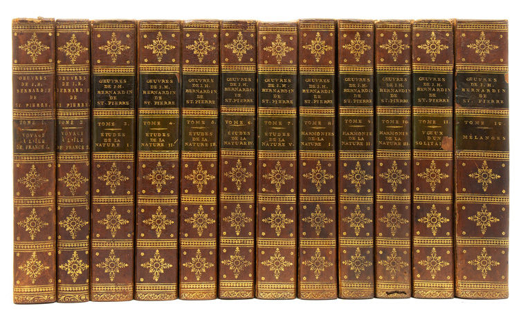 Paris: Chez Méquigon-Marvis. Libtraire, rue de L'École de Médecine, 1818. First Collected edition. Mises en ordre et Précédées de la Vie de l'Auteur, par L. Aimé-Martin. Engraved frontispiece portrait of the author in volume I and numerous other engraved plates throughout. 12 vols. 8vo (8-1/4 height; widith 1-14 inches, but varies slightly; 14 inches in total length. Full contemporary brown sprinkled calf, gilt spine with contrasing leather spine labels. Spines uniformly darkened a little, small chip from one label, otherwise a fine, clean, attractive set. First Collected edition. Mises en ordre et Précédées de la Vie de l'Auteur, par L. Aimé-Martin. Engraved frontispiece portrait of the author in volume I and numerous other engraved plates throughout. 12 vols. 8vo (8-1/4 height; widith 1-14 inches, but varies slightly; 14 inches in total length. Chiefly remembered today for his Paul et Virginie, Barnardin de Saint-Pierre was also a naturalist who wrote extensively on the harmony and order of nature. Paul et Virginie, in fact, appears in Volume IV of his Etudes de la Nature. This is the first collected edition of his works, published four years after his death in 1814. Brunet V 57