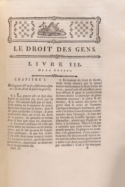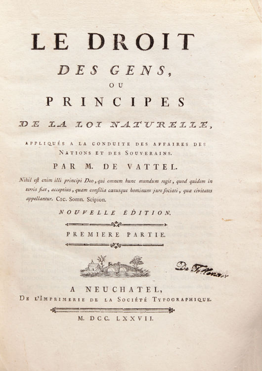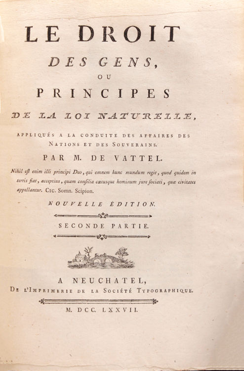 Neuchatel: De l'Imprimerie de la Société Typographique, 1777. Nouvelle édition. 1 vols. 4to. Contemporary calf. Nouvelle édition. 1 vols. 4to. One of the most important books on International Law. Jefferson particularily found it important.