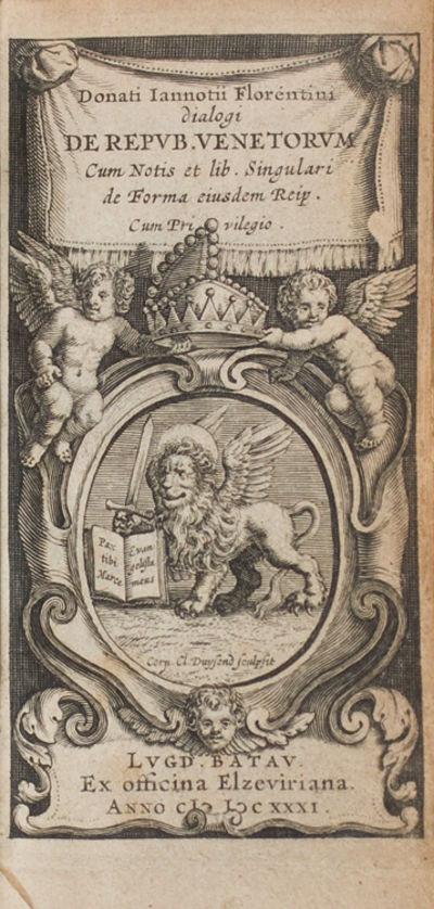 Lugd. Batavorum [Leiden]: ex officina Elzeviriana, 1631. First Elzevir edition. [2] leaves (including engraved title showing the Venetian lion, by Claude Duysend), 506 pp., [9] leaves (Index). With 7 engraved plates (most are folding, some split at folds). 1 vols. 24mo. Contemporary vellum. Very good. First Elzevir edition. [2] leaves (including engraved title showing the Venetian lion, by Claude Duysend), 506 pp., [9] leaves (Index). With 7 engraved plates (most are folding, some split at folds). 1 vols. 24mo. An in-depth study of the institutions of the Venetian republic by this Florentine author, first published in 1540, written with the hope of establishing a similar, representative form of government in Florence. The "Notes" (second part , pp. 289-416) are by Niccolò Crasso, as well as the final section ( De forma reipublicae venetae, pp. 416-506). Cicogna 1072; Willems 353 (with no mention of plates)