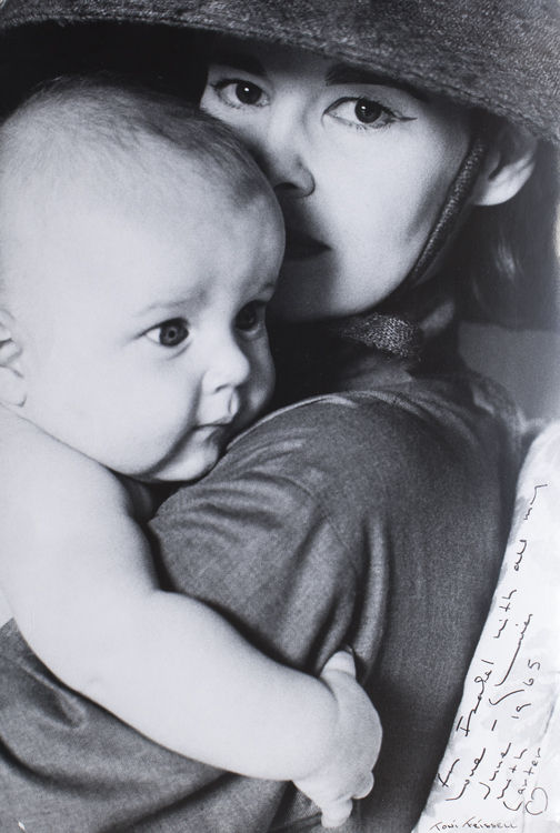 Large black and white photograph of Gloria Vanderbilt holding an infant