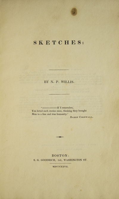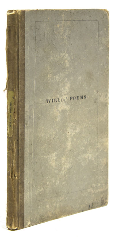 Boston: S.G. Goodrich, 1827. First Edition of the Author’s First Book. 96pp. 1 vols. 8vo. Original gray paper over boards, with “Willis’ Poems” printed on upper cover; cloth spine with paper label with same title. First Edition of the Author’s First Book. 96pp. 1 vols. 8vo. BAL 22713