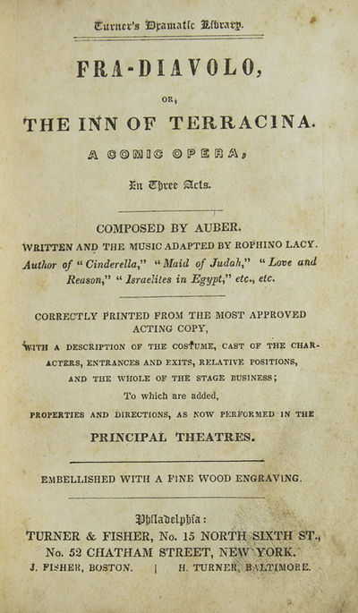 Philadelphia and Baltimore: Frederick Turner and various publishers for most, J. Robinson, Circulating Library and John H. Gihon, 1841. 1 vols. 12mo. The ten plays bound in a near contemporary half blue morocco. Rubbed, corners repaired, some browning and spotting, generally light, a few ownership signatures of Jno. Proctor 1845 and Oliver A. Judson, some contemporary marginalia, some margins trimmed. An interesting collection. 1 vols. 12mo. Containing: "Fra-Diavolo, or the Inn of Terracina. A Comic Opera. Composed by Auber. Written and the Music adapted by Rophino Lacy." [Turner]; "Songs, Duets, Glees, Recitatives, &c, &c. in the Female Sleep Walker, being a Version of Bellini's celebrated Opera of La Somnambula" [Turner]; John Home's "Douglas; the Noble Shepherd" [Turner]; J. S. Knowles' "The Wife: A Tale of Mantua" Baltimore: J. Ronson, Circulating Library, 1833; Benjamin Thompson's "The Stranger" [Turner]; H. M. Milman's "Fazio; or the Italian Wife." [Turner]; Richard Shield's "Damon and Pythias" [Turner]; R. B. Sheridan's "Pizarro" [Turner]; Joseph Reese Fry's "Norma: A Lyrical Tragedy... translated from the Italian of Felice Romani and adapted to the Original Music of Bellini." Philadelphia: Printed by John H. Gihon & Co., 1841, second edition; George Colman's "The Heir at Law." [Turner].