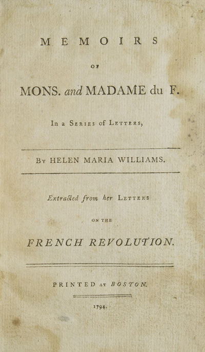 Printed at Boston, 1794. A-D6. Pp. [1, title]-[3], 4-47, [48, blank]. 1 vols. 8vo. Contemporary blue boards. Last leaf torn with loss of bottom third, not affecting text. Some staining throughout. A-D6. Pp. [1, title]-[3], 4-47, [48, blank]. 1 vols. 8vo. The French Revolution had a great impact on Williams's own life and literary career. She went to France in the summer of 1790, and her enthusiastic book about her travels, Letters Written in France (1790), would become the first of eight volumes of eyewitness accounts, later known as the Letters from France (1790-96). She explained in her first book that the historic Bastille day celebration in Paris was 'not a time in which distinctions of country were remembered. It was the triumph of human kind ... and it required but the common feelings of humanity to become in that moment a citizen of the world' (p. 14) ODNB.