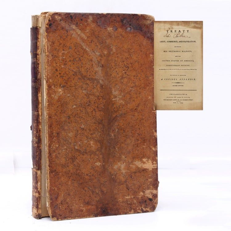 Philadelphia: Printed by Lang & Ustick for Mathew Carey, 1795. Second edition. Publisher's advertisement leaf at back. 1 vols. 12mo. Contemporary tree sheep, maroon morocco label. Binding worn, covers detached, upper margin of title cut away, some marginal browning, else sound interior with the signature of John R. Steed on title and first leaf of text. Second edition. Publisher's advertisement leaf at back. 1 vols. 12mo. Noah Webster's “Curtius's Vindication of Mr. Jay's Treaty” is in the Appendix. Jay's treaty sorted out several issues which had arisen from the Treaty of Peace of 1783, primarily those of the Northwest Territory boundary, commerce and shipping. Howes T341; Sabin 96580