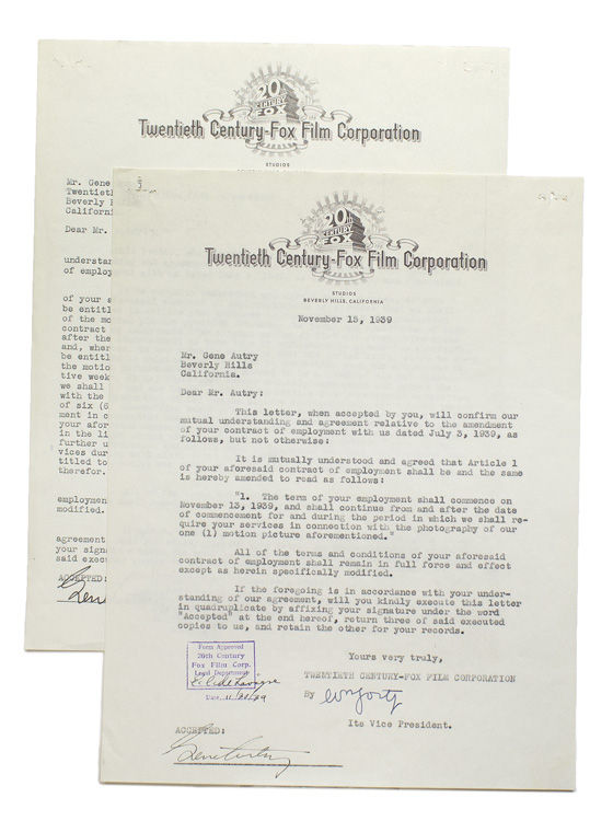 - SIGNED One page each, on studio letterhead, signed at the bottom of the orginal letter to Autry from 20th-Century Fox. In all, 2 pages.