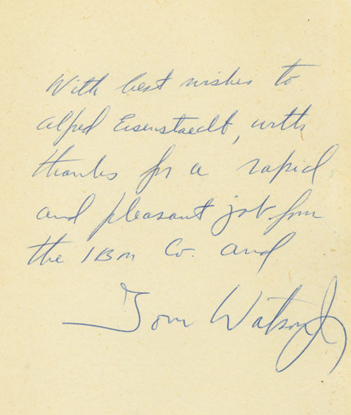 Pen and ink on paper. 1 vols. 8-3/4 x 6-1/4 inches. marginal binding holes, else fine. Pen and ink on paper. 1 vols. 8-3/4 x 6-1/4 inches. Thomas Watson, whose name has become synonymous with International Business Machines, joined the company in 1937, became President in 1952 and Chairman in 1961. Like other Eisenstaedt business subjects, he was grateful for the photographer's efficiency: he writes, “...with thanks for a rapid and pleasant job...” Eisenstaedt's portrait of Watson appears on page 203 of his WITNESS TO OUR TIME.