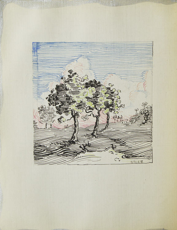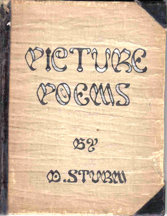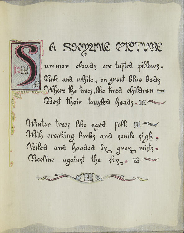 n.p., 1929. Illustrated by the author. 1 vols. 6 3/4 x 5 1/2. Original tan patterned paper over light boards, black calf backstrip and corner pieces added, lettered on upper cover, some cover wear and soiling, else fine. Illustrated by the author. 1 vols. 6 3/4 x 5 1/2" Written on 20 leaves of toned paper with hand-painted silver borders, this is a charming manuscript of eight poems, each enhanced with illuminated initials and decorations in watercolor, and containing an ink frontispiece, and a total of nine illustrations in ink and watercolor. The text is written in a decorative hand, evidently of the author's devising, rich with embellishments, the manuscript is dated AD MCMXXIX, and is dedicated “to Patience, the greatest friend of the bookmaker”, and the whole production is obviously a labor of love.