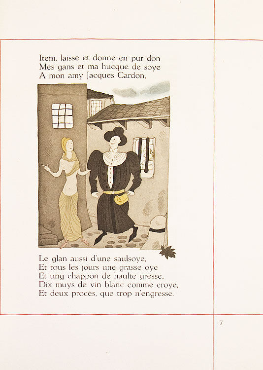 [Paris: Pierre Bouchet, 1932. Number 46 of 65 of a total edition of 110 copies. Cet ouvrage illustré de gravures orginales en couleurs de Charles Martin a été établi d'après l'édition Auguste Lognon revue par Lucien Foulet. Les gravures ont été tirées chez Roger Lacourière, maitre-imprimeur en taille-douce, à Paris. 1 vols. 4to. Bound in full crushed blue levant, a.e.g. by Max Sonséque, with matching quarter morocco chemise and leather-tipped slipcase. Number 46 of 65 of a total edition of 110 copies. Cet ouvrage illustré de gravures orginales en couleurs de Charles Martin a été établi d'après l'édition Auguste Lognon revue par Lucien Foulet. Les gravures ont été tirées chez Roger Lacourière, maitre-imprimeur en taille-douce, à Paris. 1 vols. 4to. This beautiful limited edition of the works of François Villon includes full-color illustrations and fine typography.