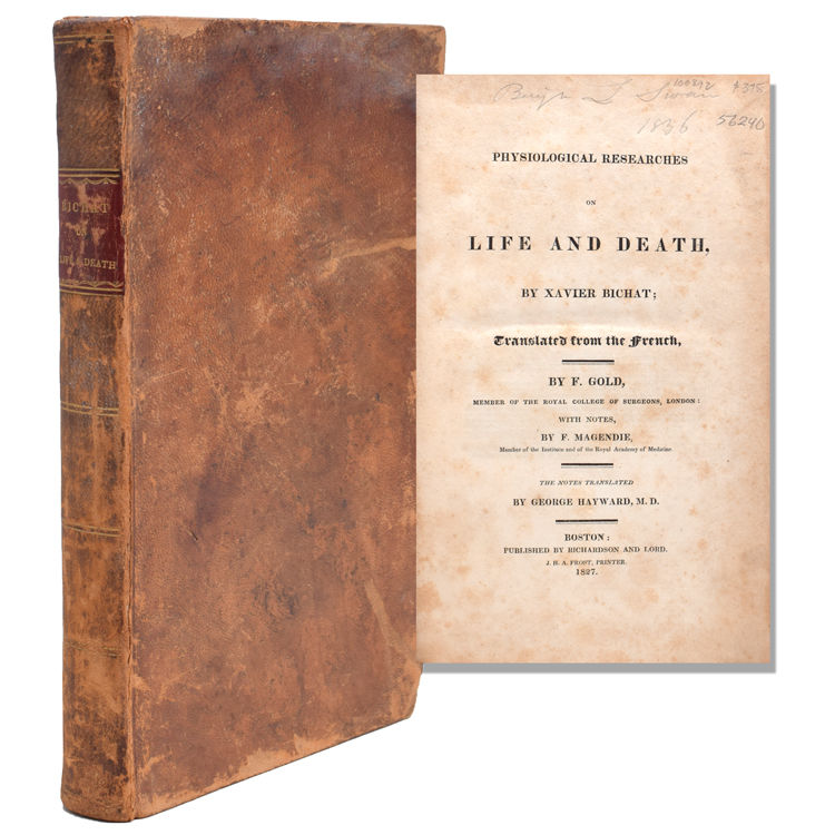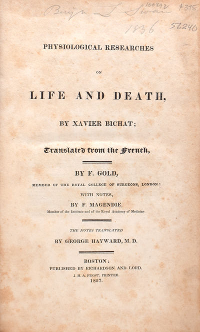 Boston: Published by Richardson and Lord. J.H.A. Frost, Printer, 1827. pp. viii, [9]-334. 1 vols. 8vo. Full contemporary sheep, worn, cover slightly sprung, foxed, front free-endpaper missing, else a very good tight copy. Signed Baj. L. Swan 1`836. pp. viii, [9]-334. 1 vols. 8vo. One of Bichat's most influential works wherein he examines what happens in violent, accidental and sudden death. See Garrison-Morton 597: "When Volta questioned the validity of experiments claiming to show responsiveness of an ex vivo heart, devoid of blood flow and nervous connections, Bichat obtained permission to experiment on the freshly killed bodies of those guillotined during the French Revolution. His trials on both laboratory animals and human cadavers led him to conclude that cardiac excitation by electricity would occur only when the organ was simulated by direct contact.