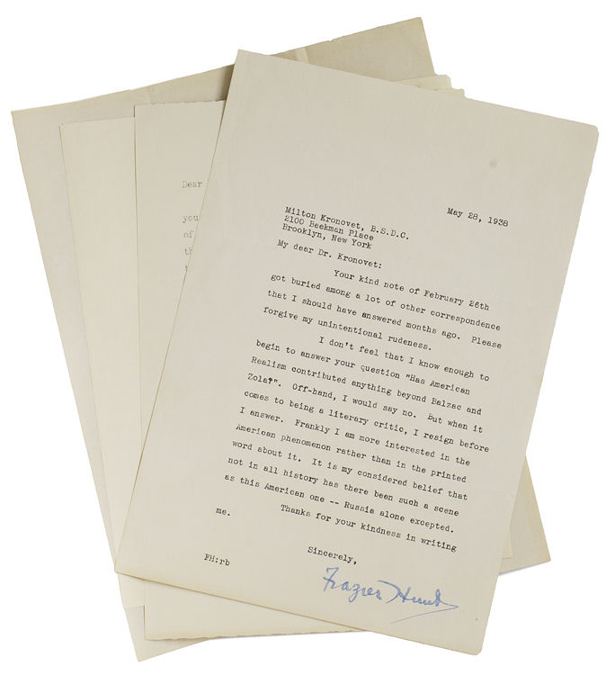 Various places, 1937. 11 pages. 1 vols. 4to. Some light soiling, else condition very good. 11 pages. 1 vols. 4to. The American authors Frazier Hunt, Flannery Lewis, Willen Brand, Rupert Hughes, Bradford Smith, Margaret Ayer Barnes and Hans Otto Storm respond to Kronovet's question “Has American Realism contributed anything beyond Balzac and Zola.” Accompanied by an autograph note signed, "Gilbert Parker” to Schoenwold thanking him for the ticket.