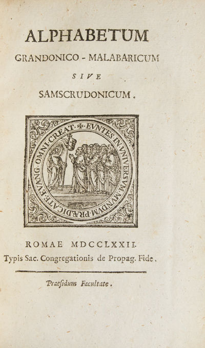 Rome: Typis. Sac. Congregationis de Propag. Fide, 1772. First edition. 9 folding charts. xxviii, 100 pp. 1 vols. Small 8vo. Recent morocco backed marbled boards, a.e.g. Fine. First edition. 9 folding charts. xxviii, 100 pp. 1 vols. Small 8vo. First type specimen of the Grantha or Malabar alphabet, now most frequently known as Malayalam. Birrell & Garnett 16; de Gubernaties 329; Smitskamp PO 207; Brunet I, 197
