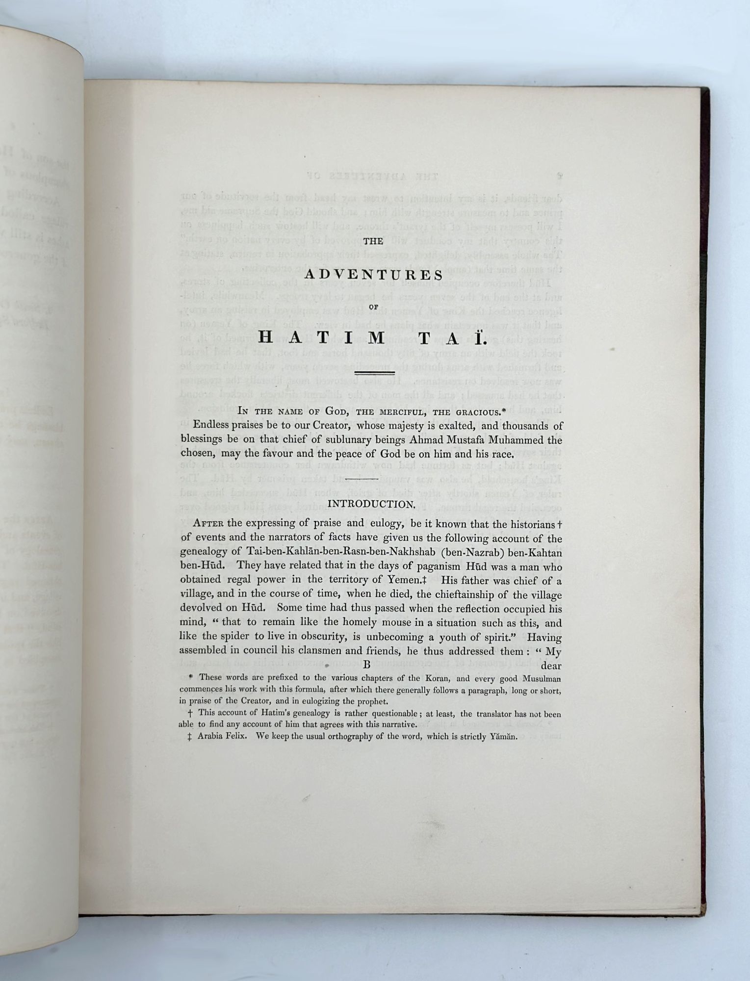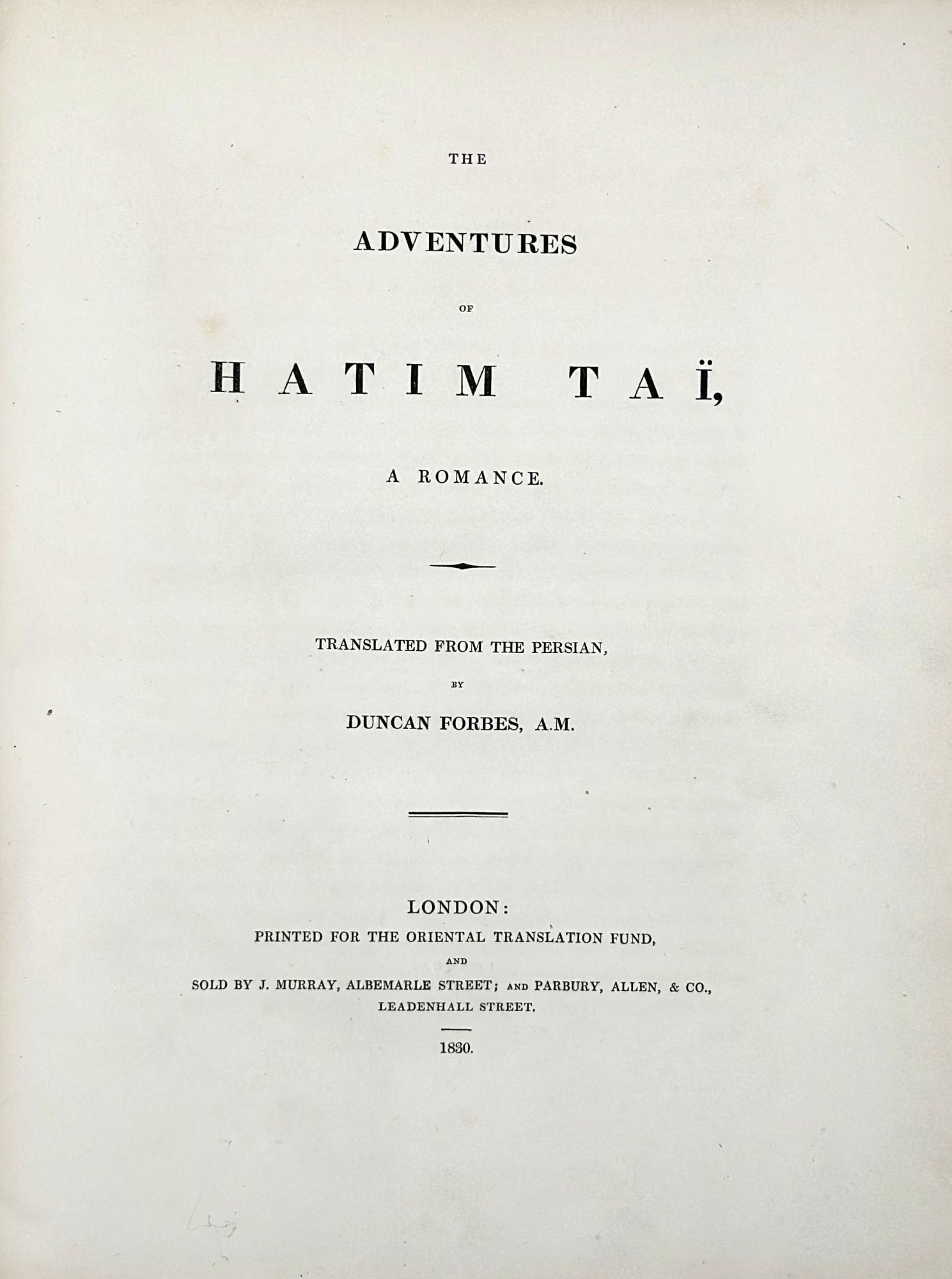 London: Printed for the Oriental Translation Fund and sold by J. Murray, 1830. First edition of Forbes' translation. Half title, six pages relating to the "Oriental Translation Fund, at the Royal Asiatic Society's House" with membership list, publications, etc. 1 vols. 4to. Contemporary half burgundy morocco, black morocco labels. Binding rubbed else an excellent copy of this work. First edition of Forbes' translation. Half title, six pages relating to the "Oriental Translation Fund, at the Royal Asiatic Society's House" with membership list, publications, etc. 1 vols. 4to. Contain seven tales of Hatin's adventures. Forbes, a noted orientalist, is equally well known for his monumental work the catalogue of the British Museum collection of Persian manuscripts and his works on chess. This translation of Hatin Täi may be his first published work.