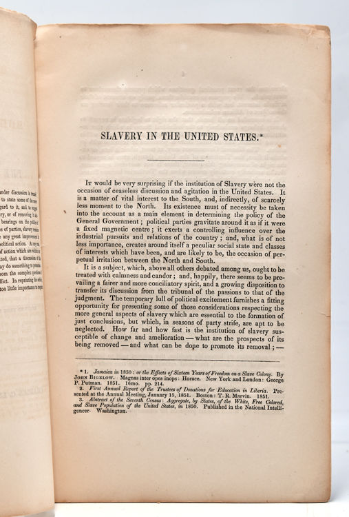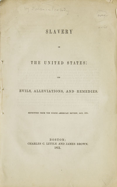 Boston: Charles C. Little and James Brown, 1851. First Edition. 36pp. 1 vols. 8vo. Original self-wrappers, small chip missing from upper margin of title and first few leaves not affecting text. First Edition. 36pp. 1 vols. 8vo. Reprinted from the North American Review, October, 1851. The author carefully issues that include “how far and how fast is the institution of slavery susceptible of change and amelioration - what are the prospects of its being removed - and what can be done to promote its removal.”. Dumond, p. 90