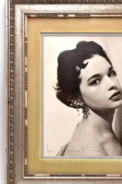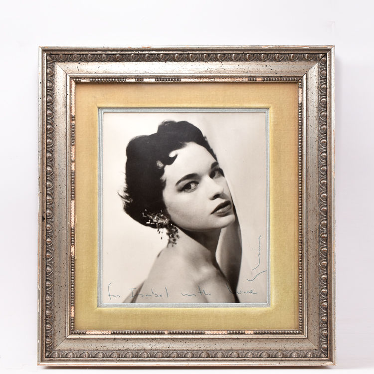 Fine head and shoulders black and white photographic portrait of Gloria Vanderbilt as a young woman, inscribed in the margin “For Isabel [Leighton] with love Gloria”