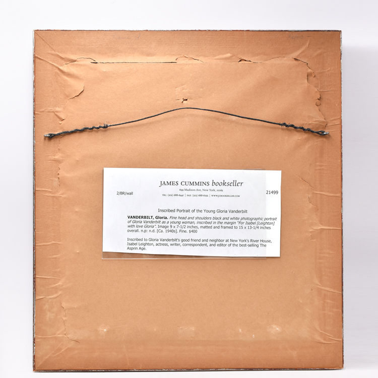 n.p., 1940. 1 vols. Image 9 x 7-1/2 inches, matted and framed to 15 x 13-1/4 inches overall. Fine. 1 vols. Image 9 x 7-1/2 inches, matted and framed to 15 x 13-1/4 inches overall. Inscribed to Gloria Vanderbilt's good friend and neighbor at New York's River House, Isabel Leighton, actress, writer, correspondent, and editor of the best-selling The Asprin Age.