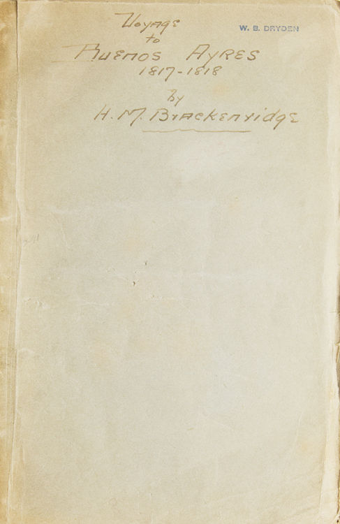 London: Printed for Sir Richard Phillips and Co. Bride-Court, Bridge-Street, 1820. Second English edition. iv, 116 pp. 1 vols. 8vo. Later wrappers. Fine. Second English edition. iv, 116 pp. 1 vols. 8vo. Brackenridge was sent in 1817-1818 by the United States Commission to investigate the Spanish province of South America. In 1819, he published his Voyage to South America, 1820, in two volumes. This English edition consists of extracts from that work. Sabin 7180