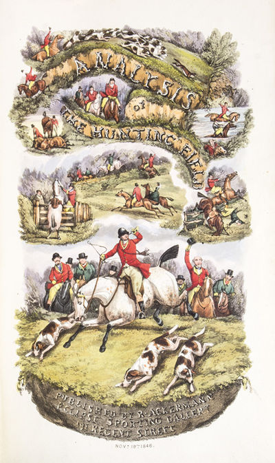 London: Published by Rudolph Ackermann, 1846. First edition in book form, first issue, with titles and preface dated 1846 and with three of the plates dated Nov. 9th. Illustrated by Henry Alken, with hand-colored title page, frontispiece and five other colored plates, and 43 wood engravings in the text. 1 vols. 4to. Contemporary half calf over marbled boards, panelled spine, sprinkled edges, covers rubbed, else fine; with Ackermann's 191 Regent Street label on front pastedown, with the armorial bookplate of Robert Fiennes Hibbert, and signature of Geo. D. Hibbet, Chalfont. First edition in book form, first issue, with titles and preface dated 1846 and with three of the plates dated Nov. 9th. Illustrated by Henry Alken, with hand-colored title page, frontispiece and five other colored plates, and 43 wood engravings in the text. 1 vols. 4to. An internally fine copy of the classic work; Tooley notes “There are early states of some of the plates with the imprint dated Nov. 9th not Nov. 19th”; in this volume there are three such early states. Tooley 470, Schwerdt II, p. 232-33; Biscotti, Six Centuries of Foxhunting, p. 359