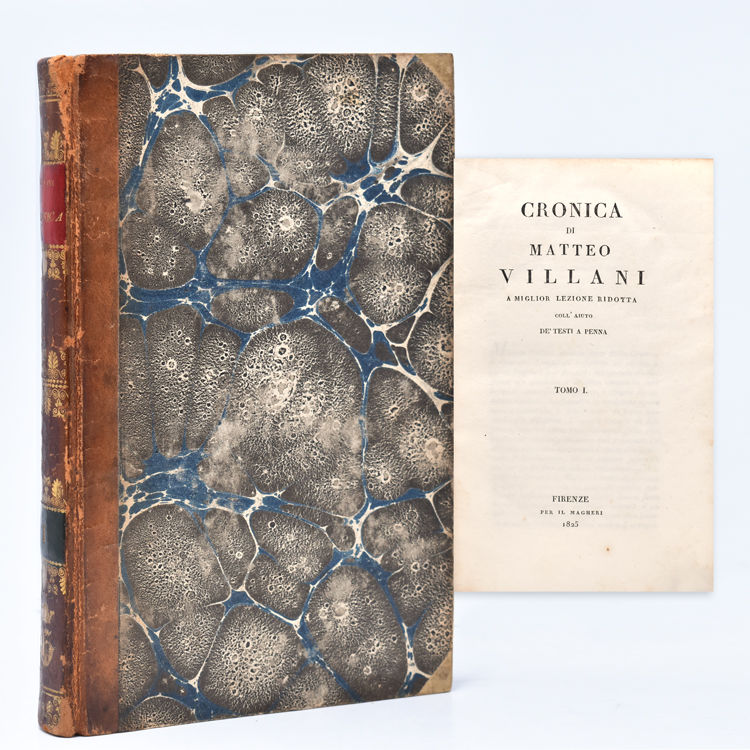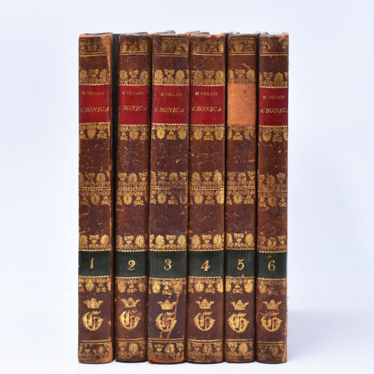 Florence: per Il Magheri, 1826. 6 vols. 8vo. Bound in contemporary quarter polished brown calf and marbled boards, one title label missing, else fine. Bookplate of Byrdcliffe. 6 vols. 8vo. Giovanni Villani (ca 1275-1348), the Florentine writer of the famous chronicles (the Cronica) is the greatest Italian chronicler of his own times and the cornerstone of the early medieval history of Florence. His interest in economic details makes him the most modern of the late medieval chroniclers... Villani's Chronicle was considered an important work at the time, valuable enough to be continued by two other members of his family. Matteo Villani, his brother, of whom nothing is known save that he was twice married and that he died of the plague in 1363, continued it down to the year of his death. Wordier and less acute as a human observer, Matteo is well informed in his facts and is one of the most important sources of Italian history.