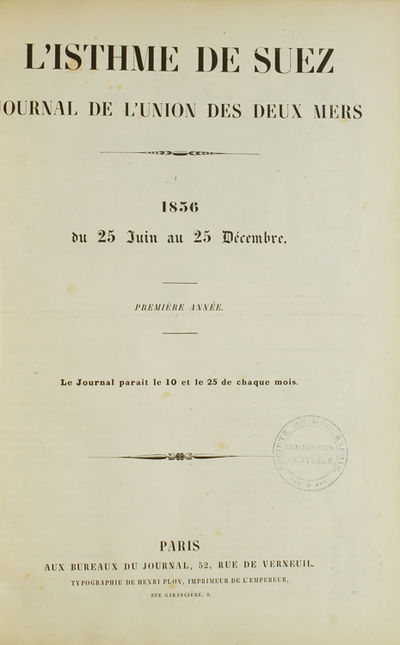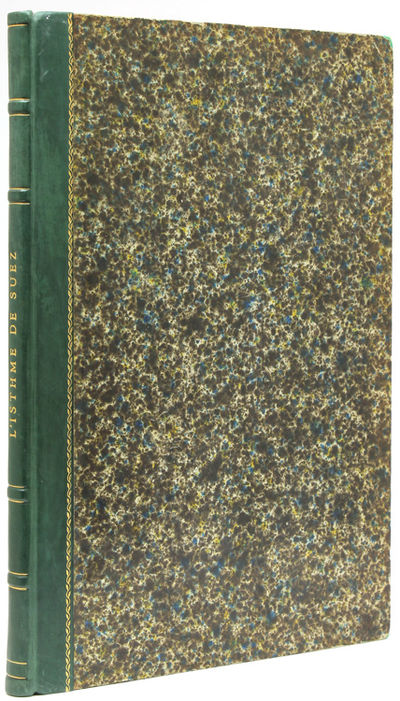 Paris: aux Bureaux du Journal, 1856. Large folding sectional elevation of the Isthmus of Suez (approx. 84 inches in length). Volume 1 (Première Année), Nos. 1-13. Each number with large woodcut vignette headpiece showing the Suez Canal; index at pp. 209-214. [2], 214 pp. 1 vols. Small folio. Recent quarter green calf and nineteenth-century marbled boards. Stamp of Société de Géographie on title. Fine. Large folding sectional elevation of the Isthmus of Suez (approx. 84 inches in length). Volume 1 (Première Année), Nos. 1-13. Each number with large woodcut vignette headpiece showing the Suez Canal; index at pp. 209-214. [2], 214 pp. 1 vols. Small folio. First 13 numbers of this scarce periodical devoted entirely to the Canal project and related subjects; it includes progress reports, bulletins from Egypt on local conditions as they relate to the project, international “faits divers”, etc.