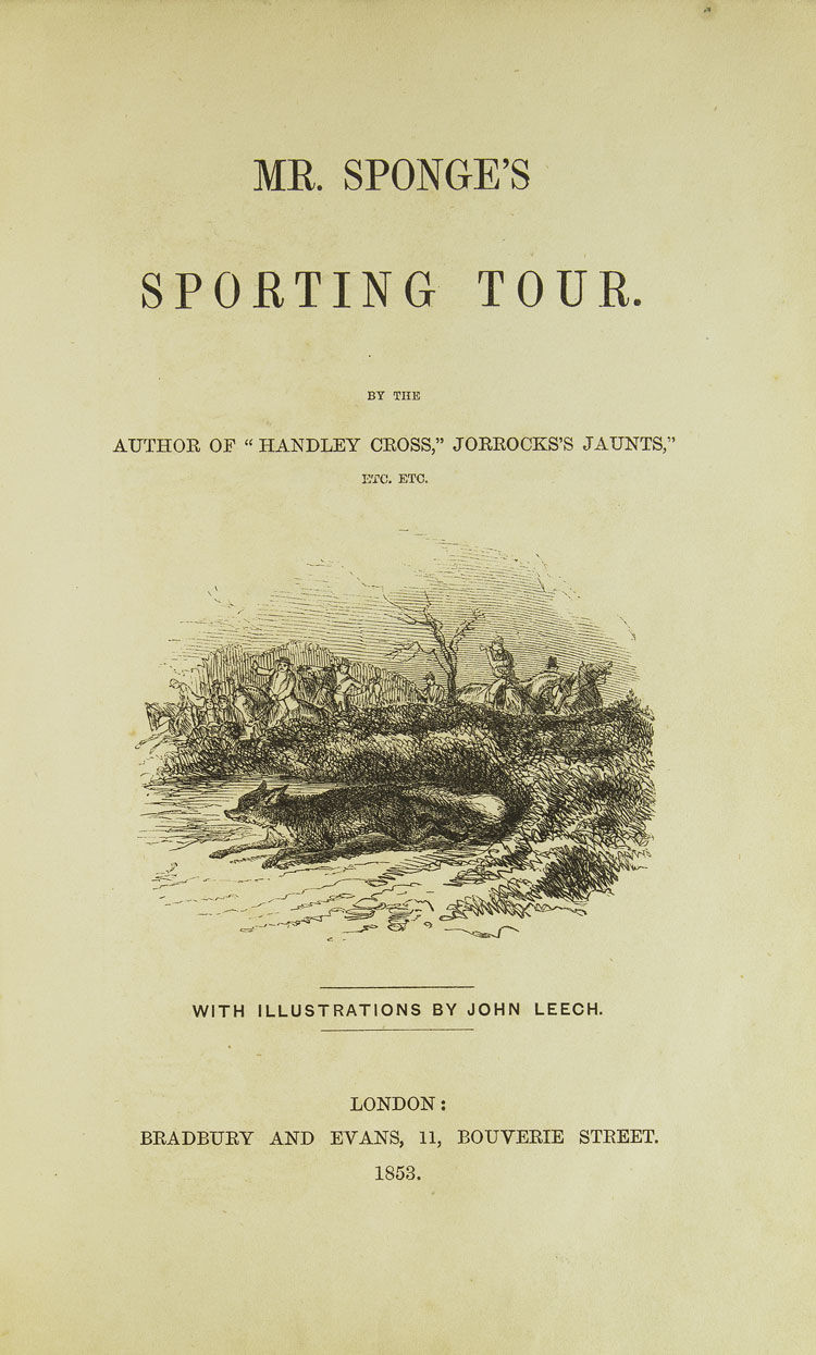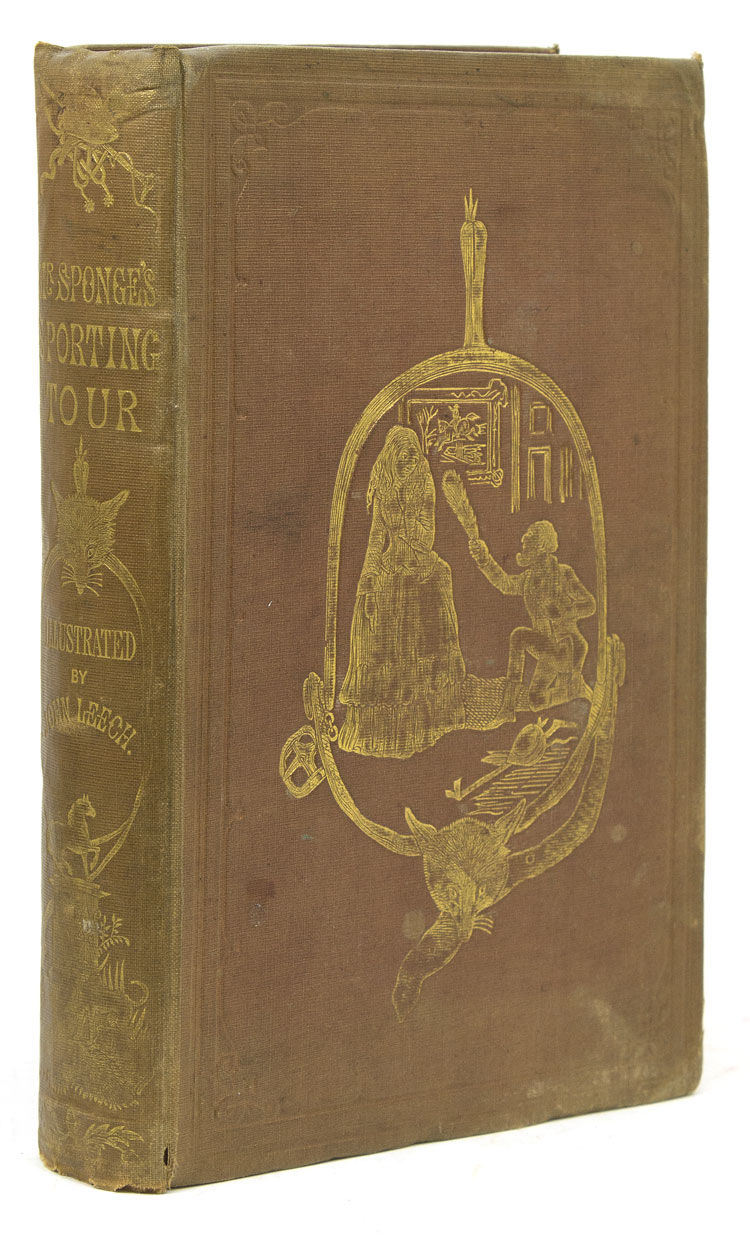London: Bradbury and Evans, 1853. First edition. Hand colored frontispiece, 12 hand colored steel engravings, and numerous woodcut illustrations by John Leech. 1 vols. 8vo. Original tan pictorial cloth, gilt, some cover wear, shaken, else internally near fine. Cloth wrapper. First edition. Hand colored frontispiece, 12 hand colored steel engravings, and numerous woodcut illustrations by John Leech. 1 vols. 8vo. Surtees’ classic sendup of the English propertied classes, through the lens of the hunting field. The freeloading Sponge is a hilarious creation and Surtees is as keen an observer of the financial view of world (and marriage) in Victorian Britain as Dickens, and as Jane Austen was of Georgian society. Biscotti, Six Centuries of Foxhunting, p. 361