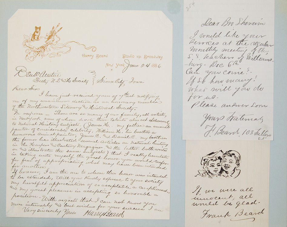 New York, 1886. Each one page. 1 vols. 4to (letter from Harry, on his Studio stationery); 8vo, 12mo. Tipped and mounted to larger sheet of stiff blue paper. Each one page. 1 vols. 4to (letter from Harry, on his Studio stationery); 8vo, 12mo. A very interesting letter from Harry Beard regarding his distinguished family of artists and illustrators, in response to his election as honorary member of the Northwestern Literary & Historical Society: