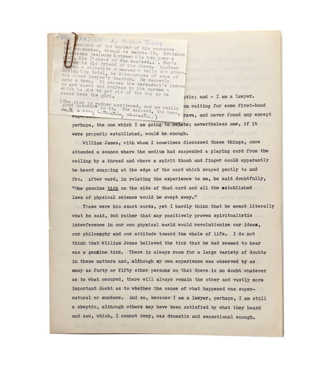 “Three - Thirteen”: Typescript of this detective story, on 30 pages, approximately 9000 words. With a note at the end that indicates the story appeared in Popular Magazine, Nov. 7, 1919