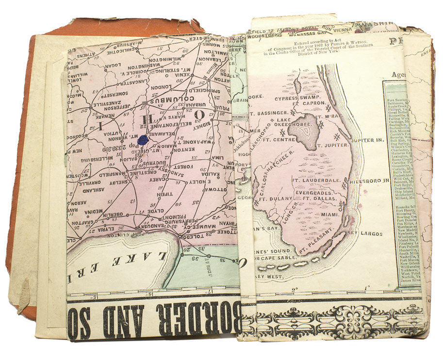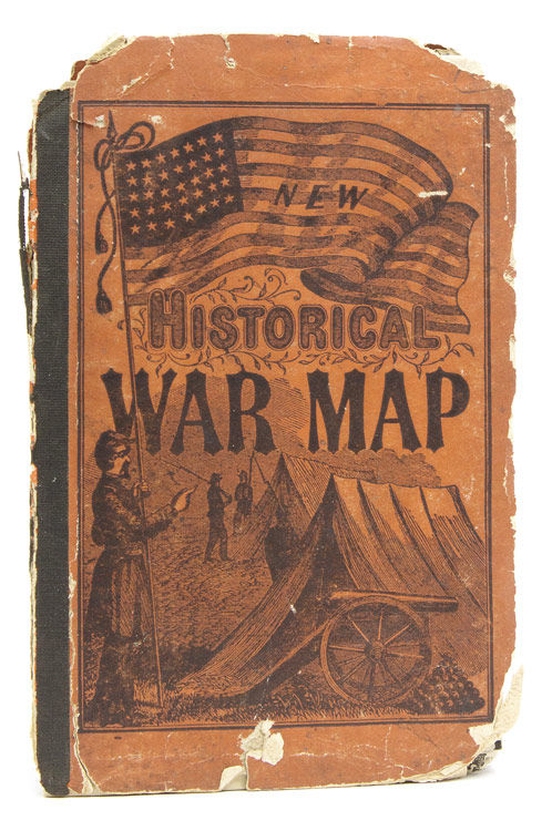 New York: Phelps & Watson, Publishers, 16 Beekman St, 1864. Fold out hand-colored map. 1 vols. 60 x 88 cm (35 x 29 inches), folded in cover to 18 x 12 cm. (6-1/2 x 4-1/2 inches); with 35 pp booklet “Brief Description of Battles and Skirmishes of he War”. Orange printed pictorial boards, cloth spine, with 35 booklet tipped to inside front cover. Fragile binding is splitting at cloth spine, corners are chipped; map torn along folds, one small tear into image. Interestingly, the map is stamped on the verso; "Price 50 cts. for the benefit of a one armed soldier"; and signed by an early NYC owner. Fold out hand-colored map. 1 vols. 60 x 88 cm (35 x 29 inches), folded in cover to 18 x 12 cm. (6-1/2 x 4-1/2 inches); with 35 pp booklet “Brief Description of Battles and Skirmishes of he War”. Fragile and very scarce map from the Civil War, this copy being issued after May, 1864, as the final entry on the accompanying booklet listing skirmishes concludes with 'spotsylvania, Pa." The map itself locates battles and skirmishes by means of red dots or by red underlining of place names, and it also gives the population statistics for each state. OCLC locates 4 copies, and the map is not in ot in Stephenson Civil War Maps in the Library of Congress.